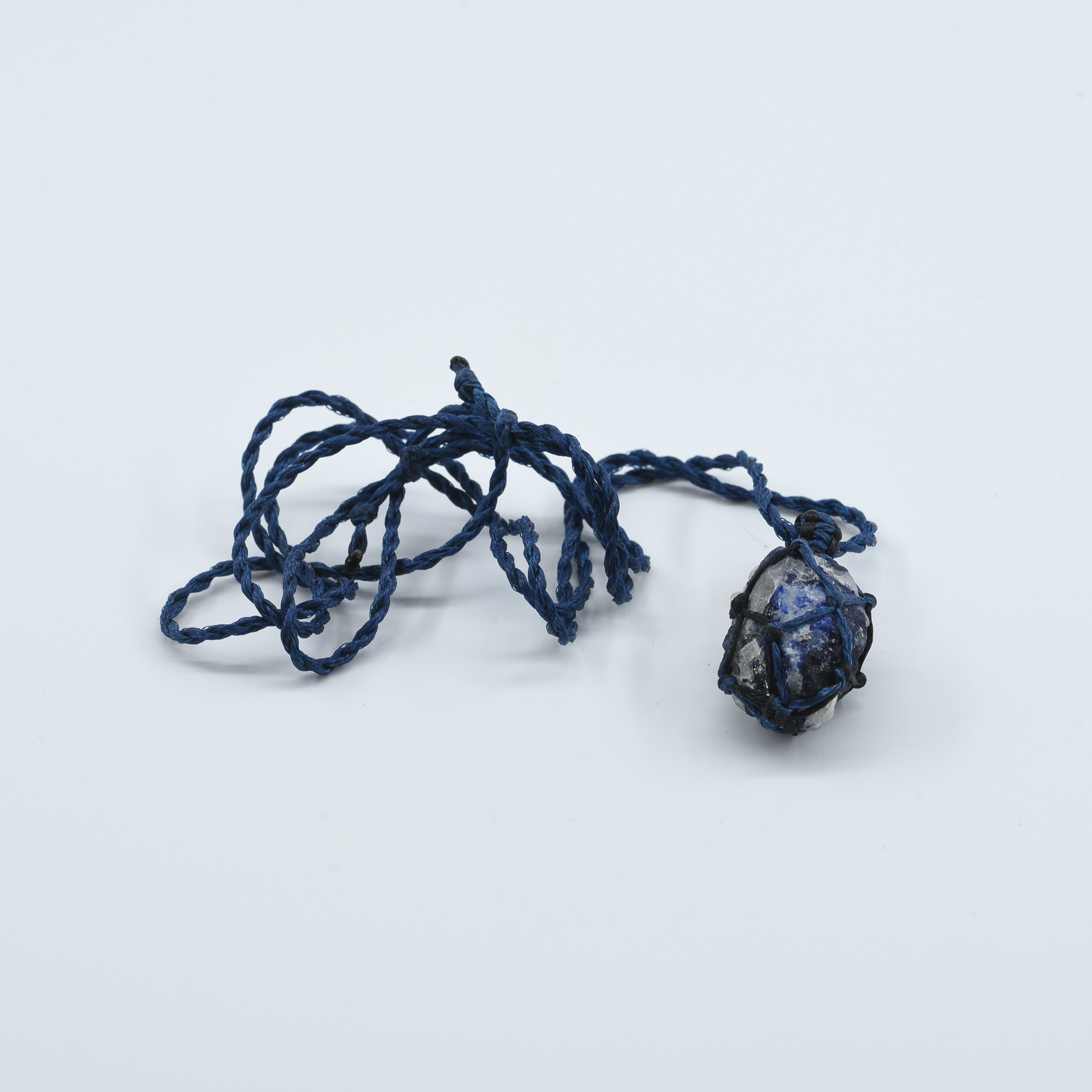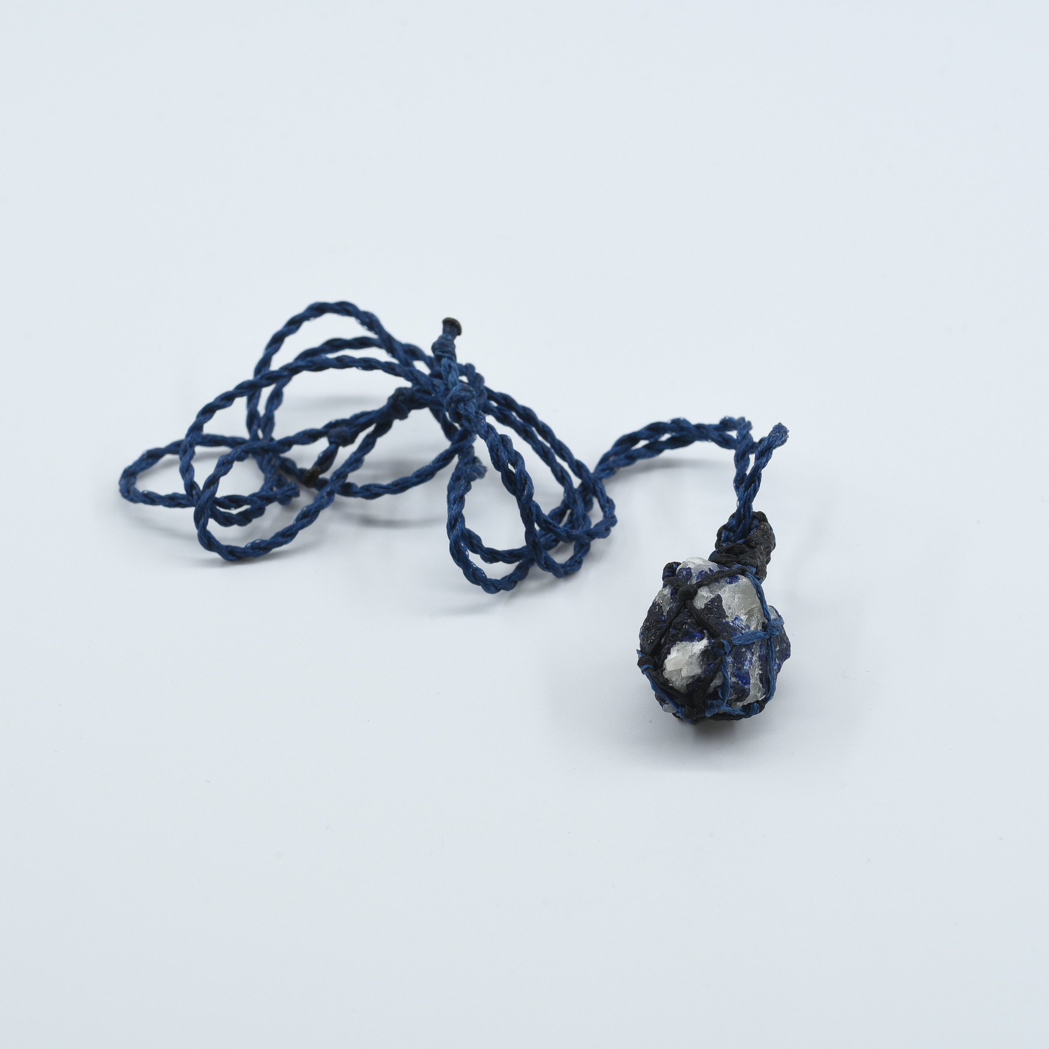 This pendant features a raw, naturally shaped afghanite crystal, secured in a dark blue macramé net made from durable twisted cord. The stone displays its characteristic deep blue and white coloration, with subtle translucency and natural surface textures that highlight its untouched, organic form.