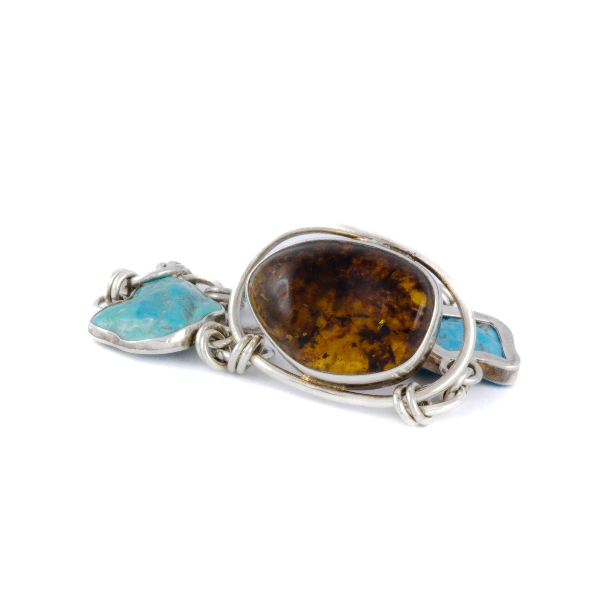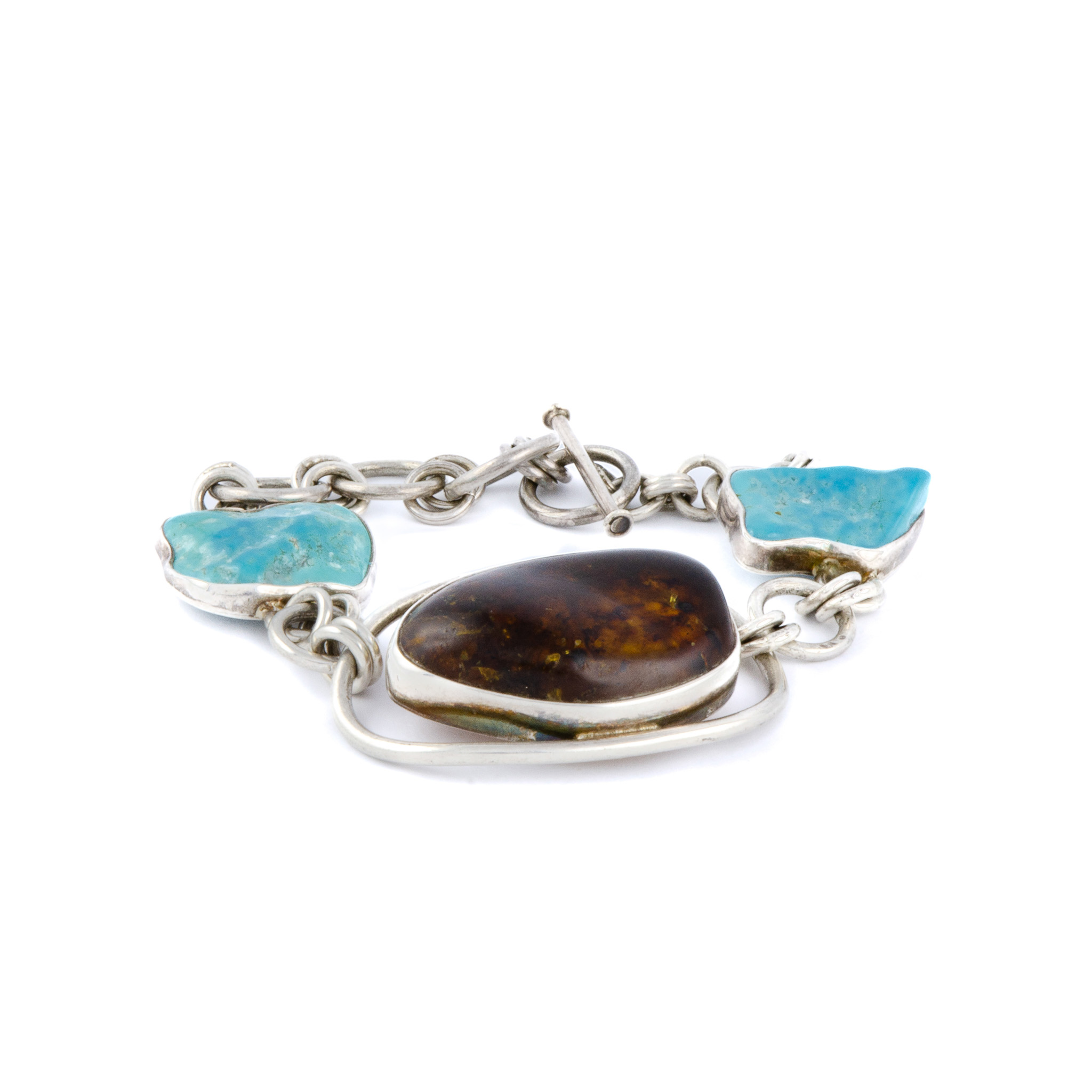 Handcrafted in Mexico, this stunning bracelet features a captivating blend of polished amber and vibrant lapis lazuli stones, each set in sterling silver. The rich, golden-brown amber centerpiece exudes warmth and ancient energy, while the irregularly shaped blue lapis lazuli stones add a vibrant and earthy contrast. The toggle clasp enhances both comfort and elegance.