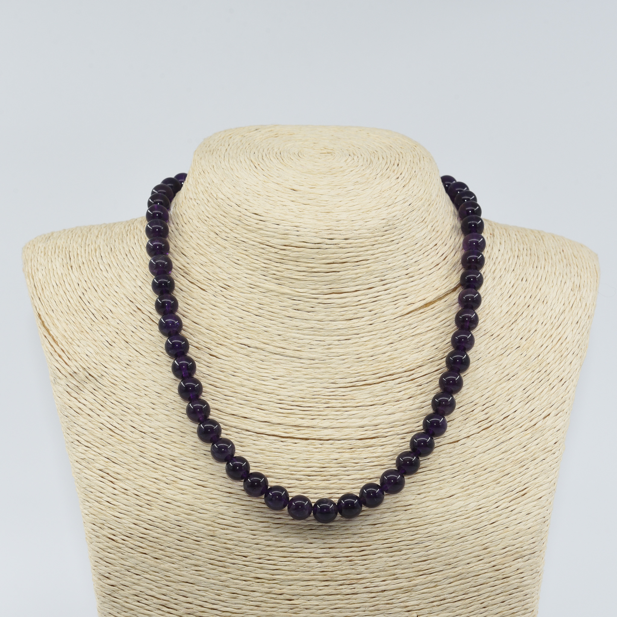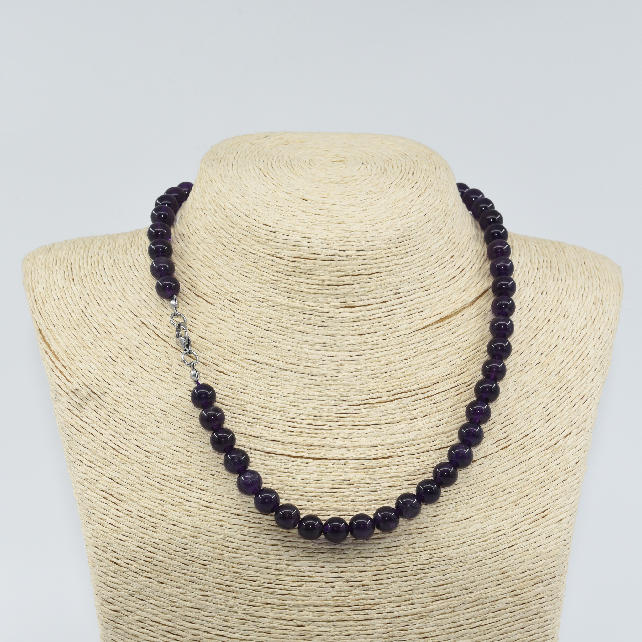 Elegant Amethyst gemstone necklace in a deep violet hue, known as the Stone of Peace and Intuition. Amethyst is cherished for its soothing energy, clarity of mind, and spiritual protection.