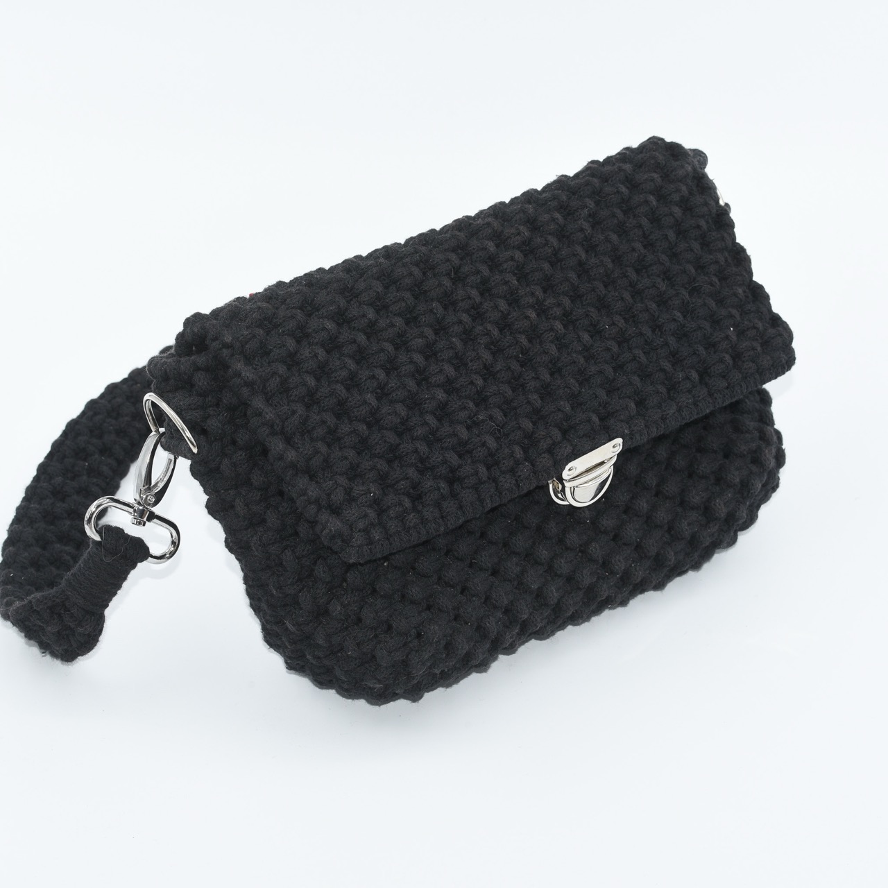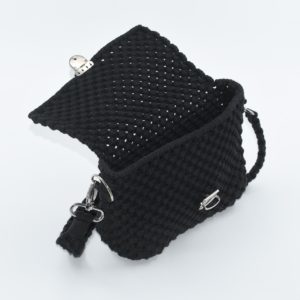 THIS BAG is a sleek and versatile bag, handcrafted in Hungary using 100% organic cotton yarn. Its deep black color and structured crochet technique give it a clean, modern look while maintaining an artisanal character. It features a top handle and a matching long shoulder strap, allowing it to be carried by hand or worn crossbody. The flap is secured with a silver-tone clasp, offering both style and function.