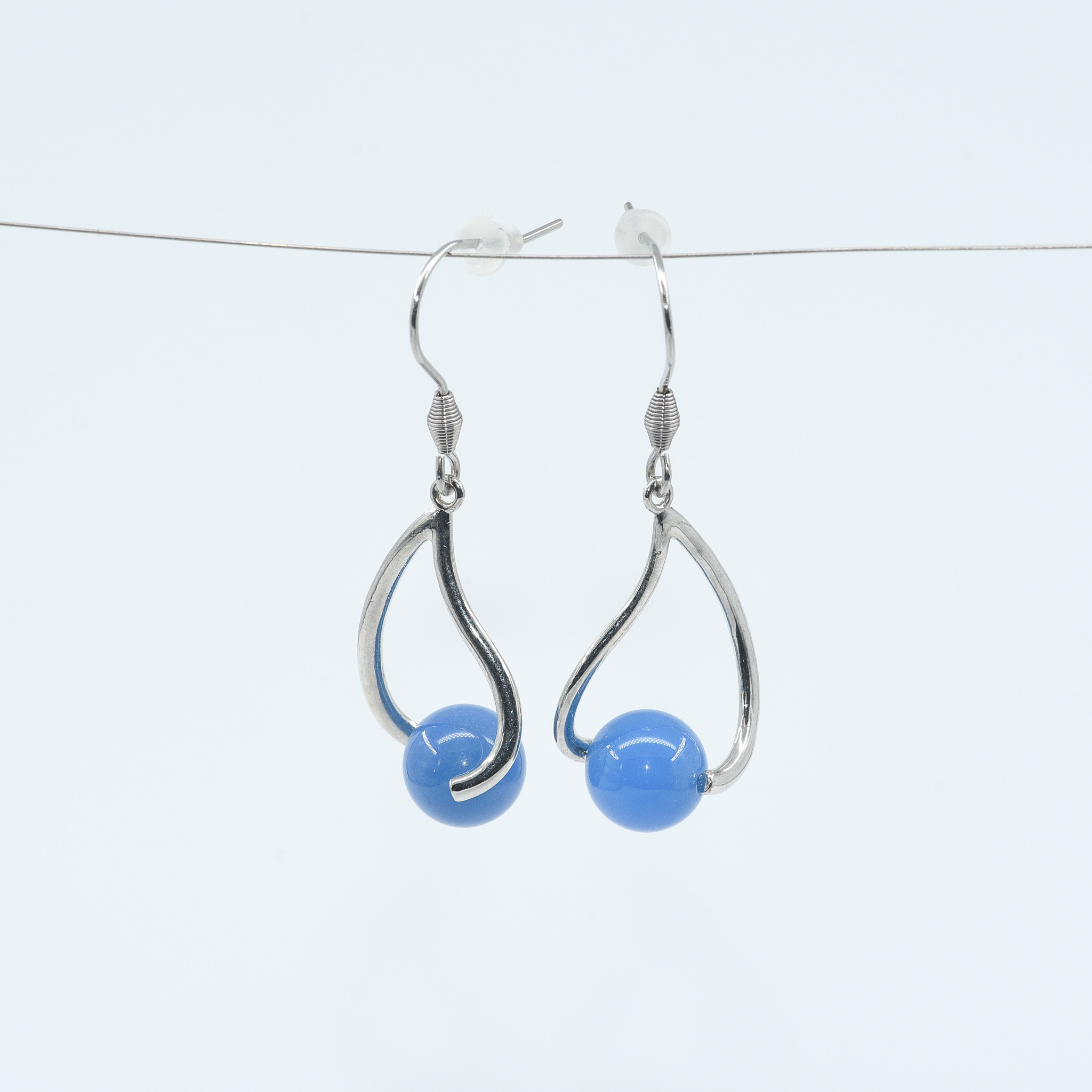 Elegant artisan earrings featuring polished blue agate gemstones, carefully wrapped in minimalist silver-tone wire. The smooth round stones radiate calm and harmony, making these earrings a beautiful choice for both casual and elegant wear.