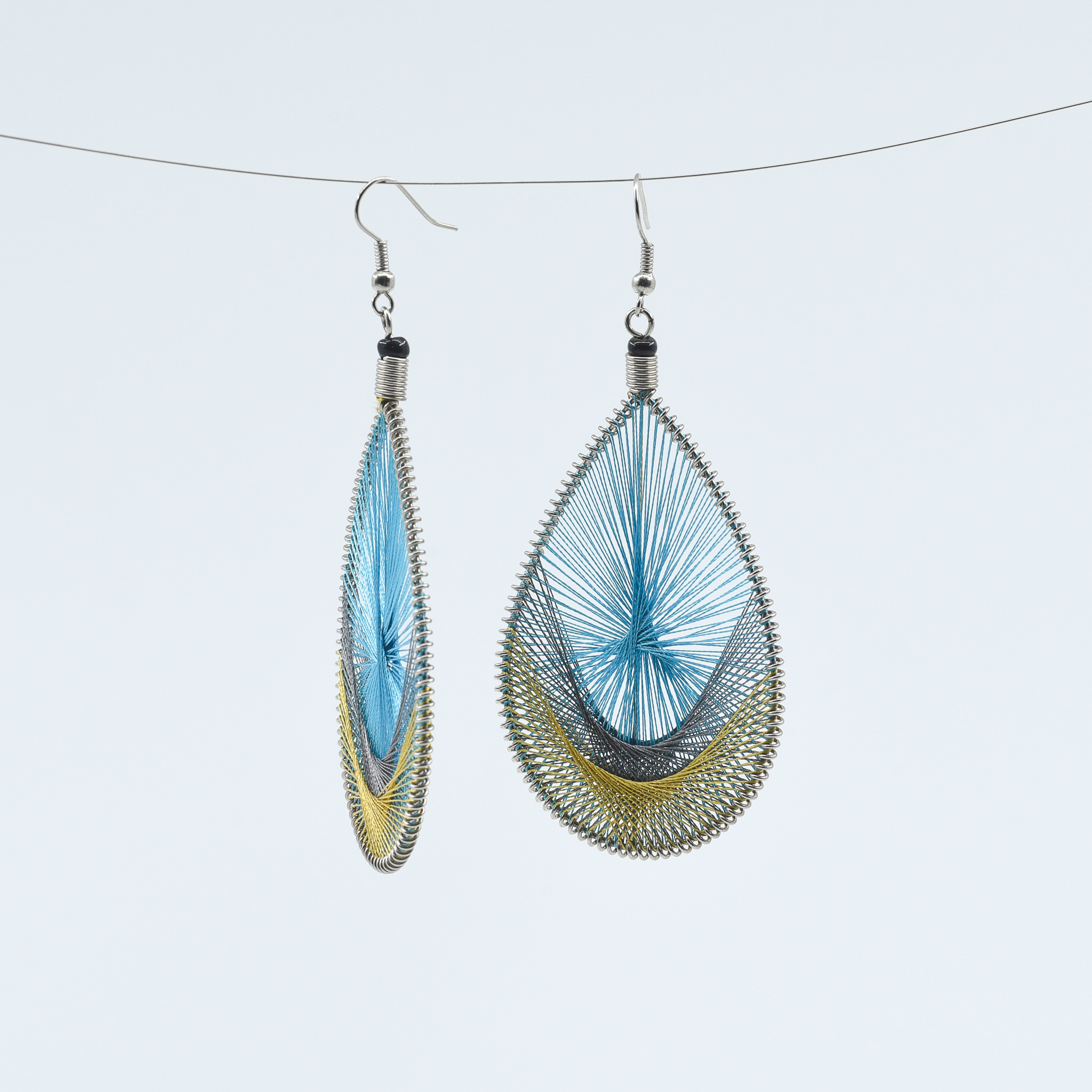 Featuring a striking sky blue and golden combination, these earrings evoke the freshness of air and sunlight. A tribute to Guatemalan craftsmanship with traditional thread artistry and silver findings.