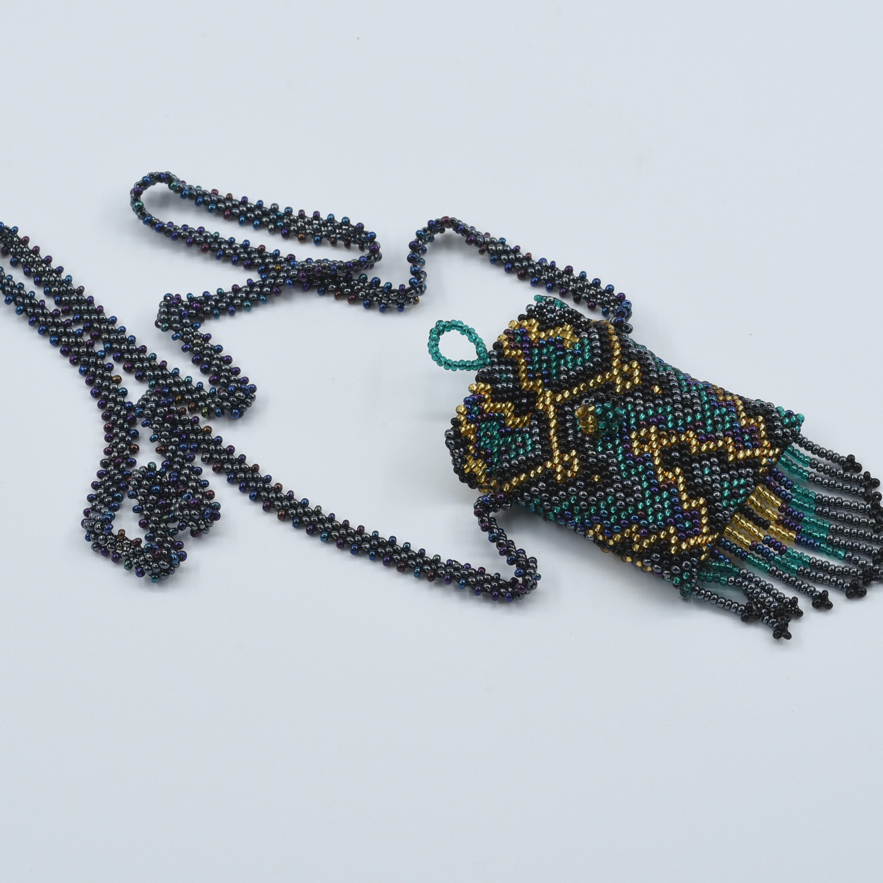 The Bosque Sagrado Amulet Pouch Necklace is a meticulously handwoven piece from Guatemala, crafted by an Indigenous woman artisan. Made from vibrant glass seed beads in forest-inspired tones of deep green, ochre, and black, it is both a striking adornment and a practical talisman pouch.