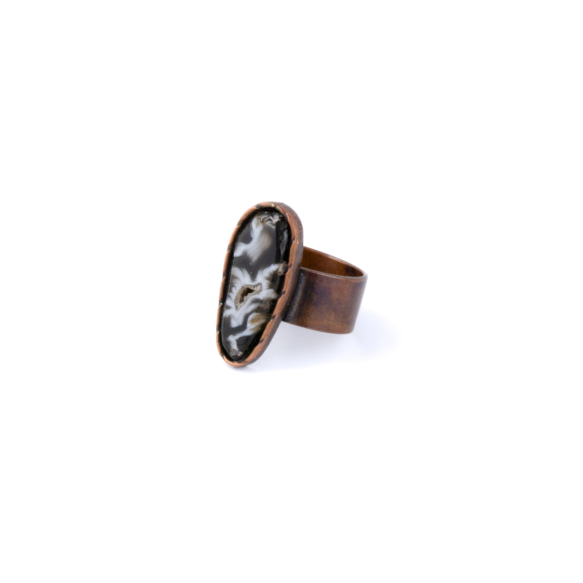 A unique handcrafted ring made of copper with a carved black face cameo. Adjustable and full of character, this piece is a blend of rustic charm and personal expression.