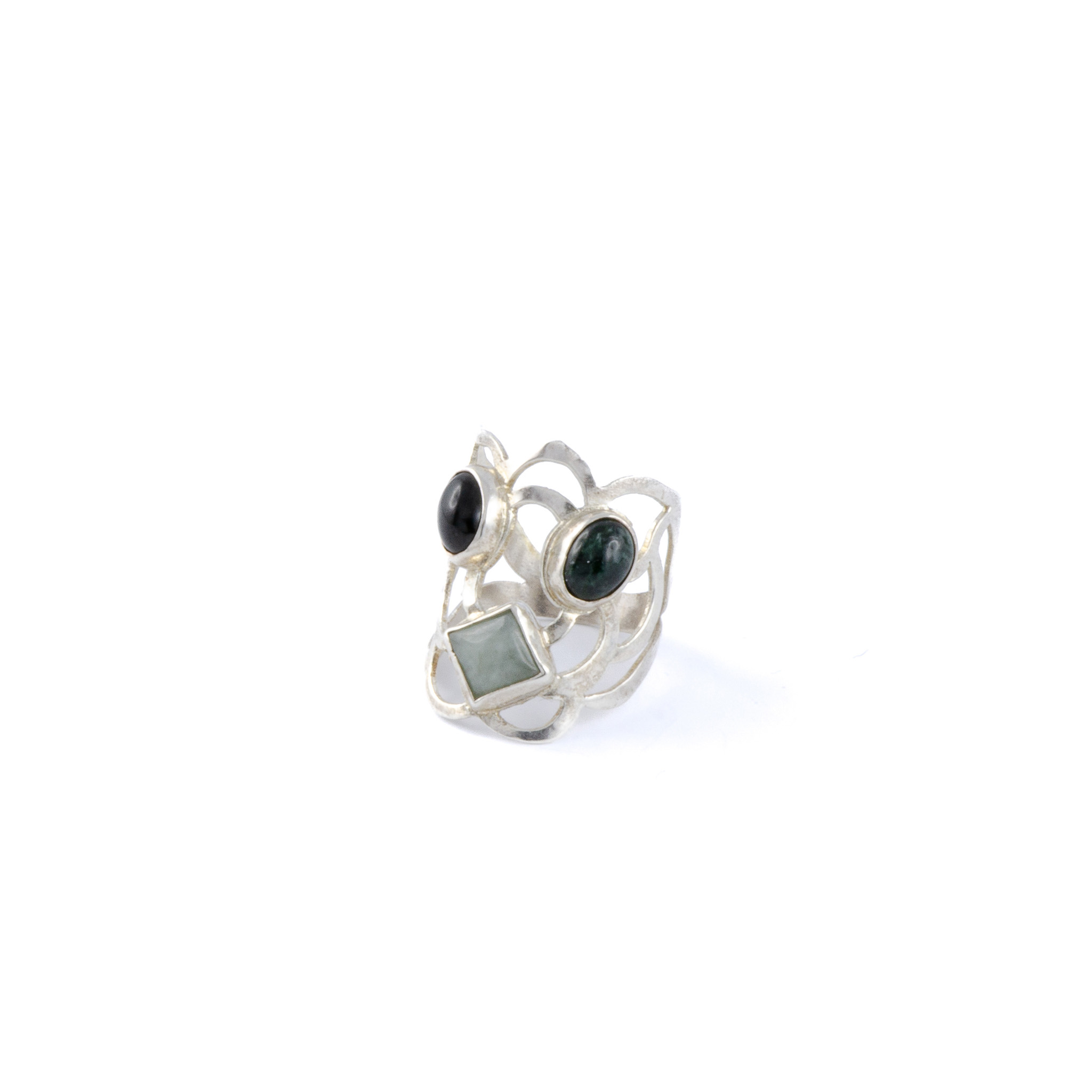 This elegant handcrafted ring features two dark jade stones arranged like eyes, with a light jade diamond shape at the center. The flowing silver lines give the design an organic, sacred feeling. A striking piece that combines symbolism with timeless style. Features: