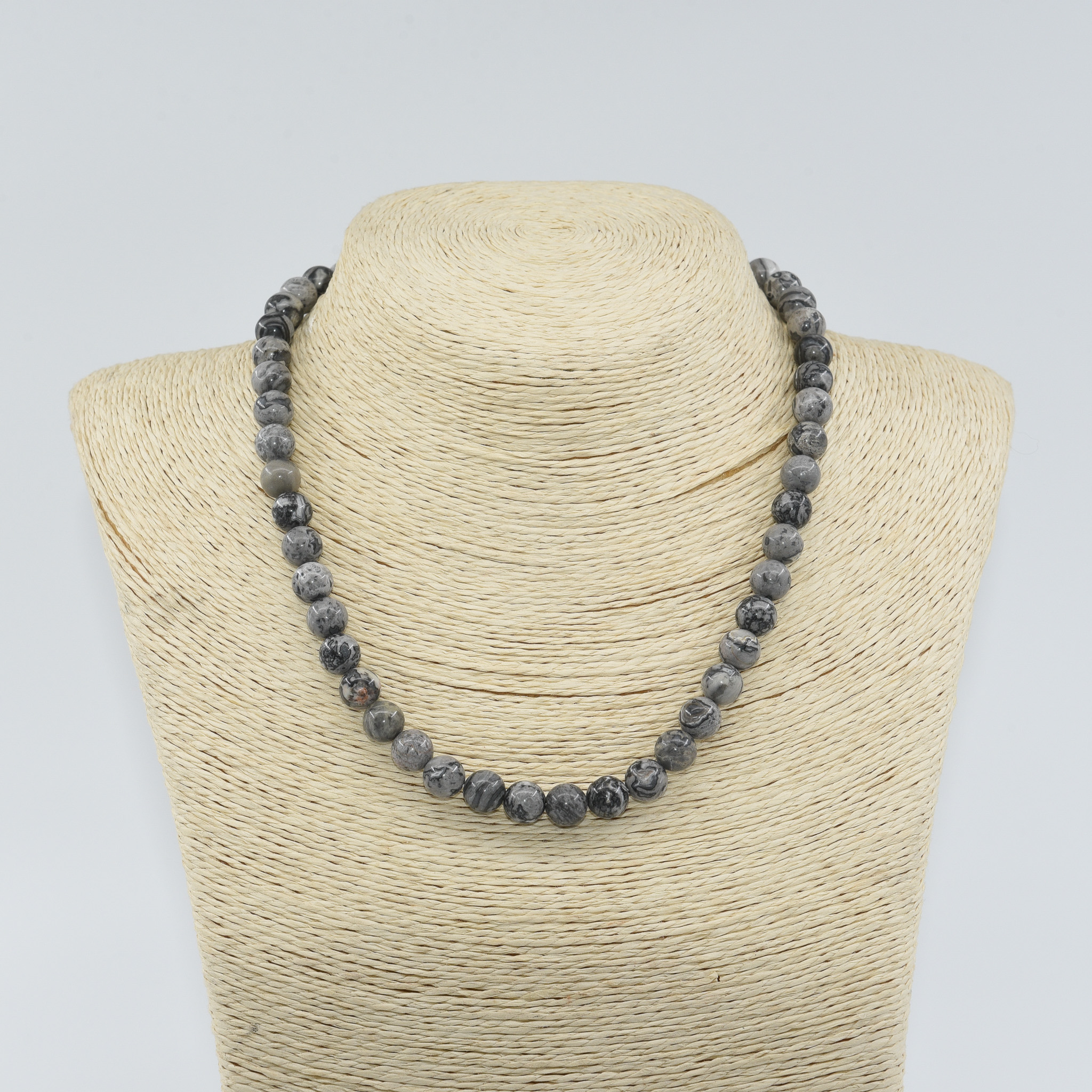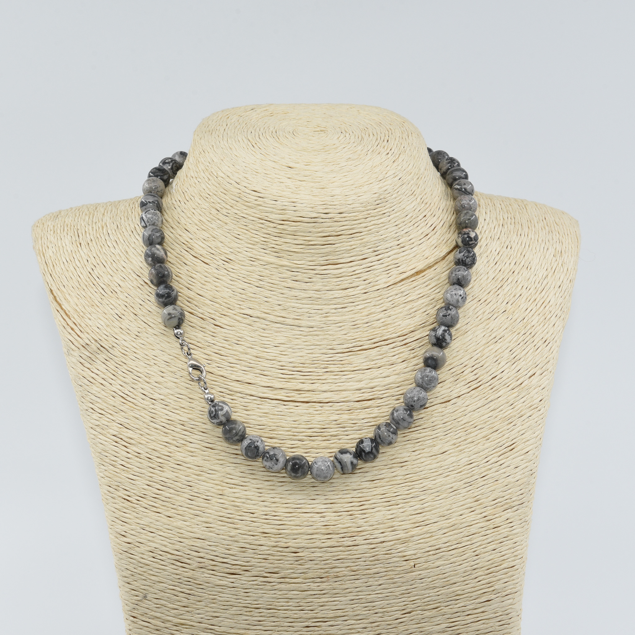 A soothing Dolomite gemstone bracelet featuring beautifully patterned grey and white beads. Known as a Stone of Calm and Balance, Dolomite helps release tension, promote patience, and encourage emotional stability.