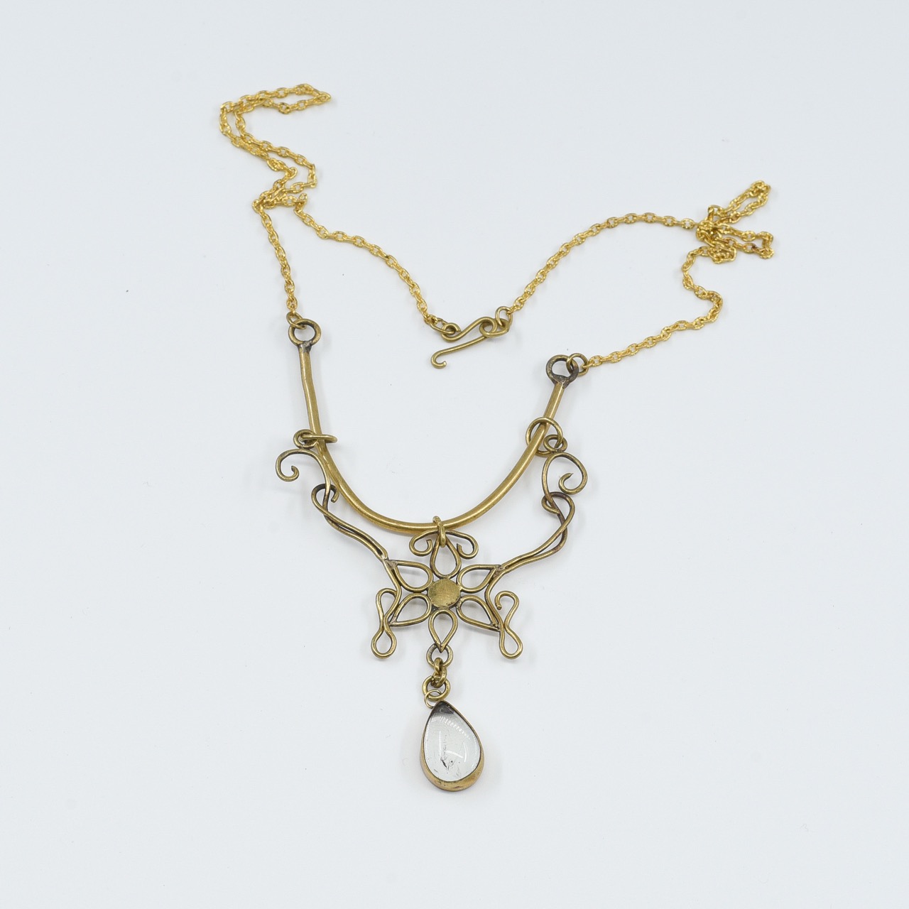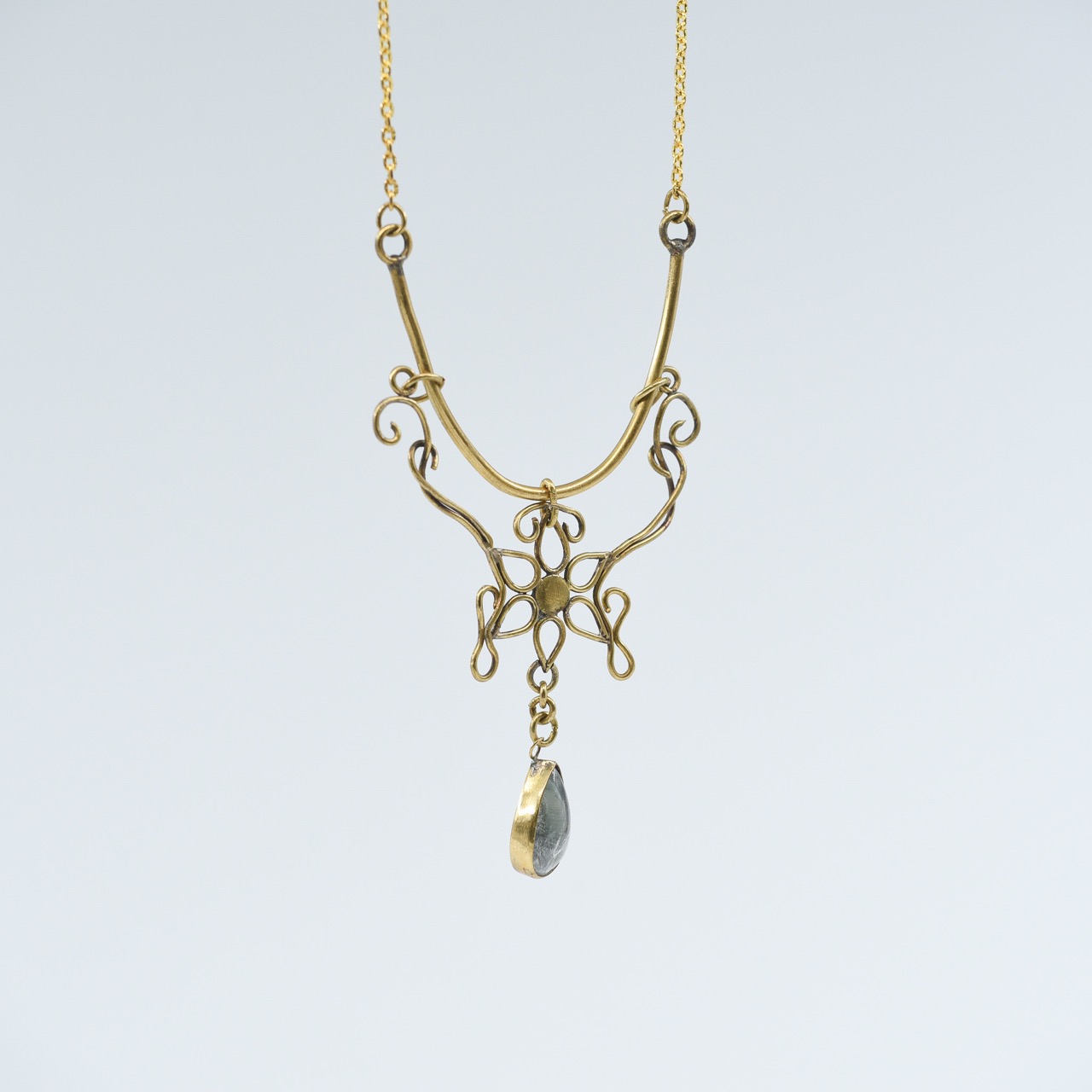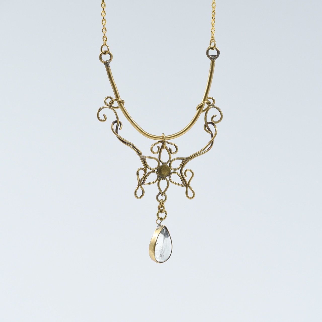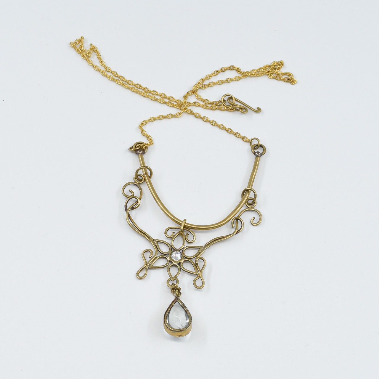An airy brass structure with flowing curves and a dangling teardrop-shaped crystal. Like a metallic dreamcatcher, light and ornamental. Crafted in Hungary by a skilled female metalsmith.