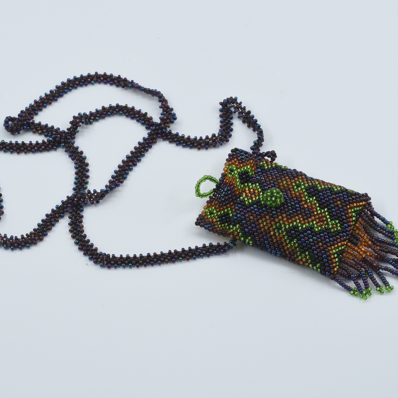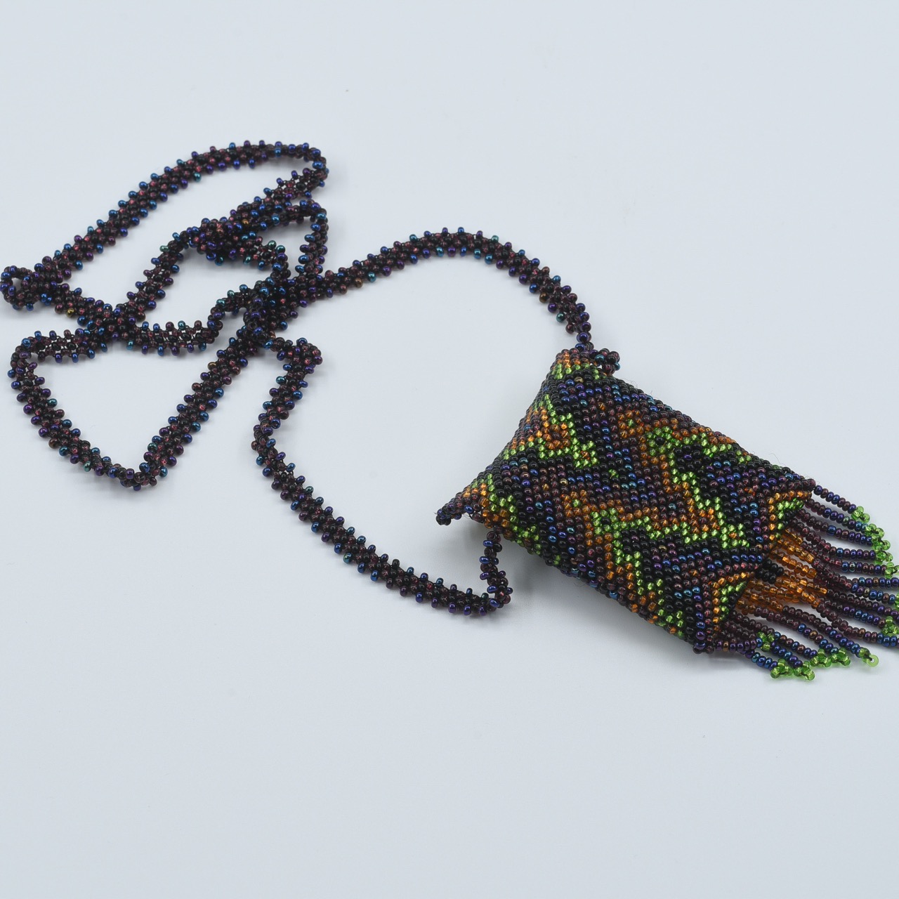 The Espíritu del Viento Amulet Pouch Necklace is a dynamic and elegant piece, handcrafted by an Indigenous woman artisan in Guatemala. It features soft greys, silvers, and pale blues in a flowing, wave-like pattern—resembling the wind’s gentle presence and guiding energy.