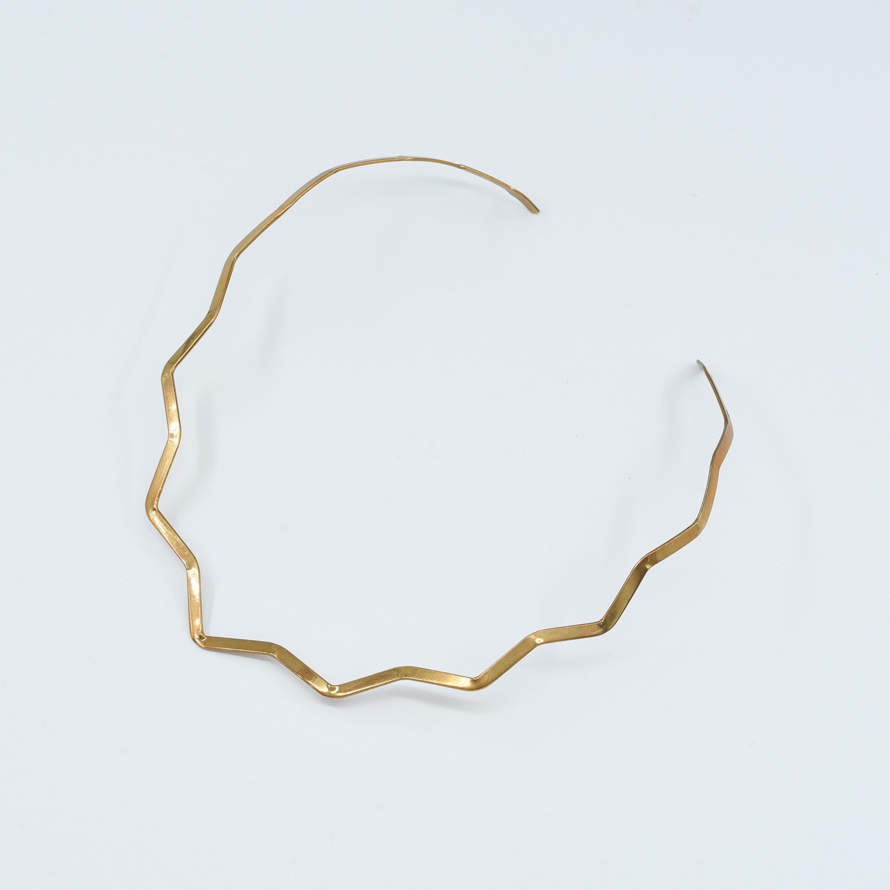 The Fulgor Collar is a bold expression of form and power. Forged from brass and finished with radiant gold plating, this handcrafted open necklace features a zigzag silhouette that hugs the neckline with modern drama and sculptural elegance.