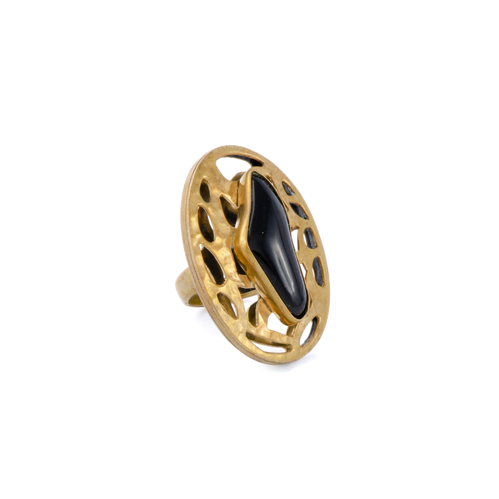 Understated elegance meets bold design in this gold-coated brass ring, set with a sleek black jade stone. With its deep, glossy finish and minimalist silhouette, this ring exudes quiet strength and refined style.