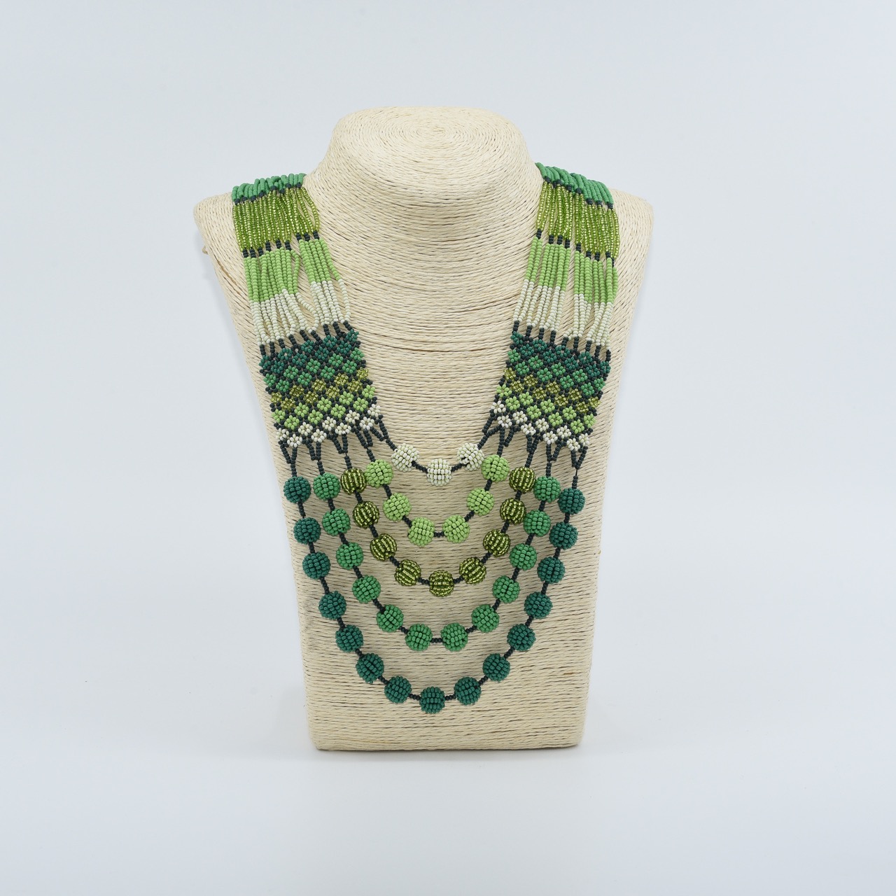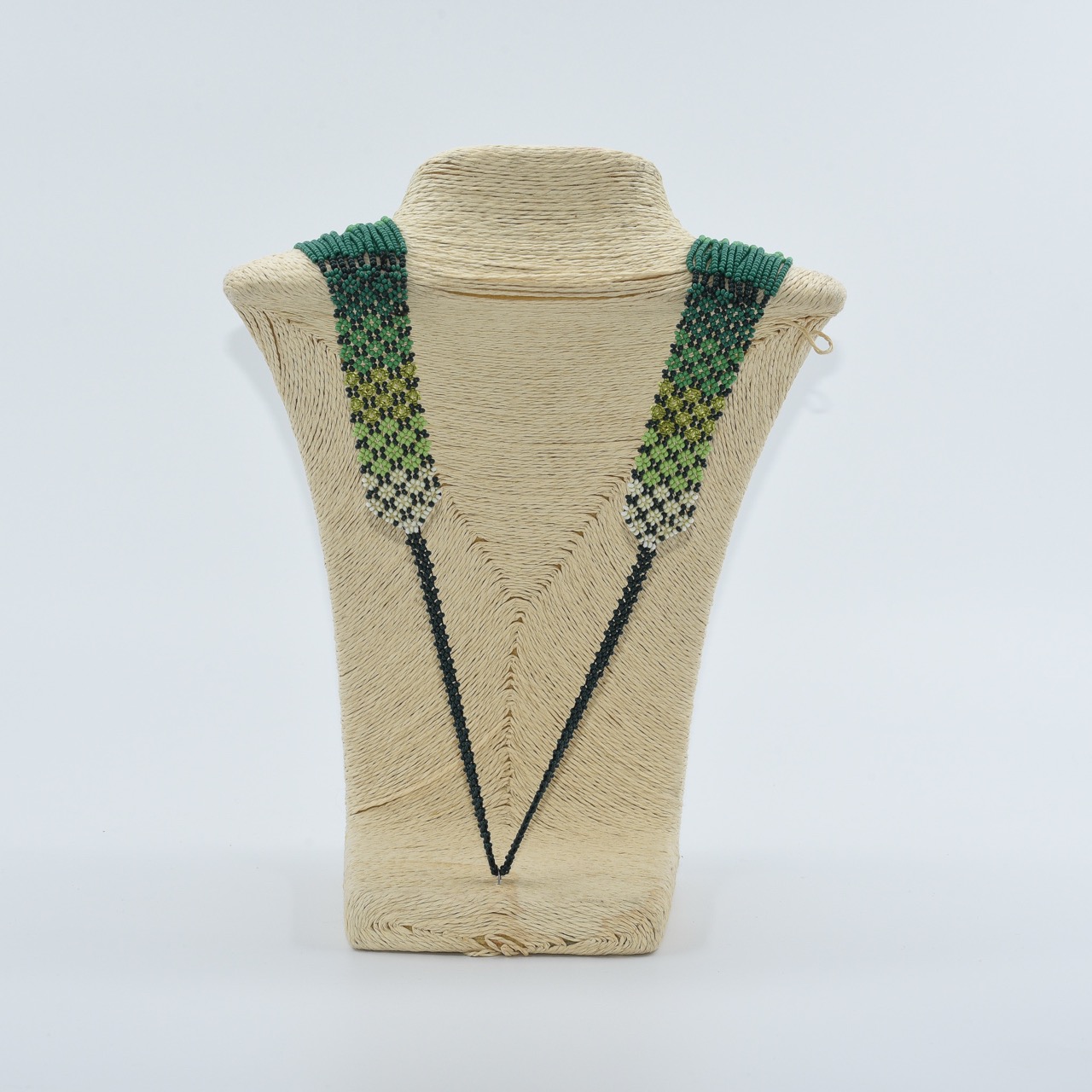 Inspired by the vibrant beauty of Colombia’s rainforests, this handmade beaded necklace is a stunning piece of Emberá artistry. Crafted with meticulous detail using traditional chaquira techniques, it features a rich palette of greens, emerald, forest, lime, and white, woven into striking geometric and vertical patterns.