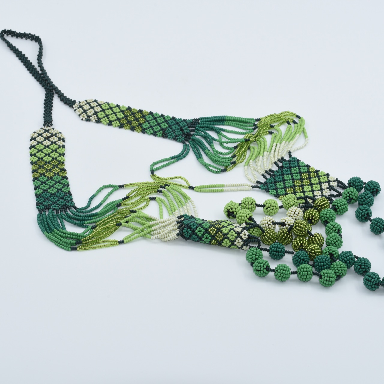 The necklace gracefully blends structured bead weaving with flowing strands and spherical bead tassels, giving it both elegance and dynamic movement. The bottom is adorned with tightly woven beaded globes that sway gently with motion—adding texture and charm.