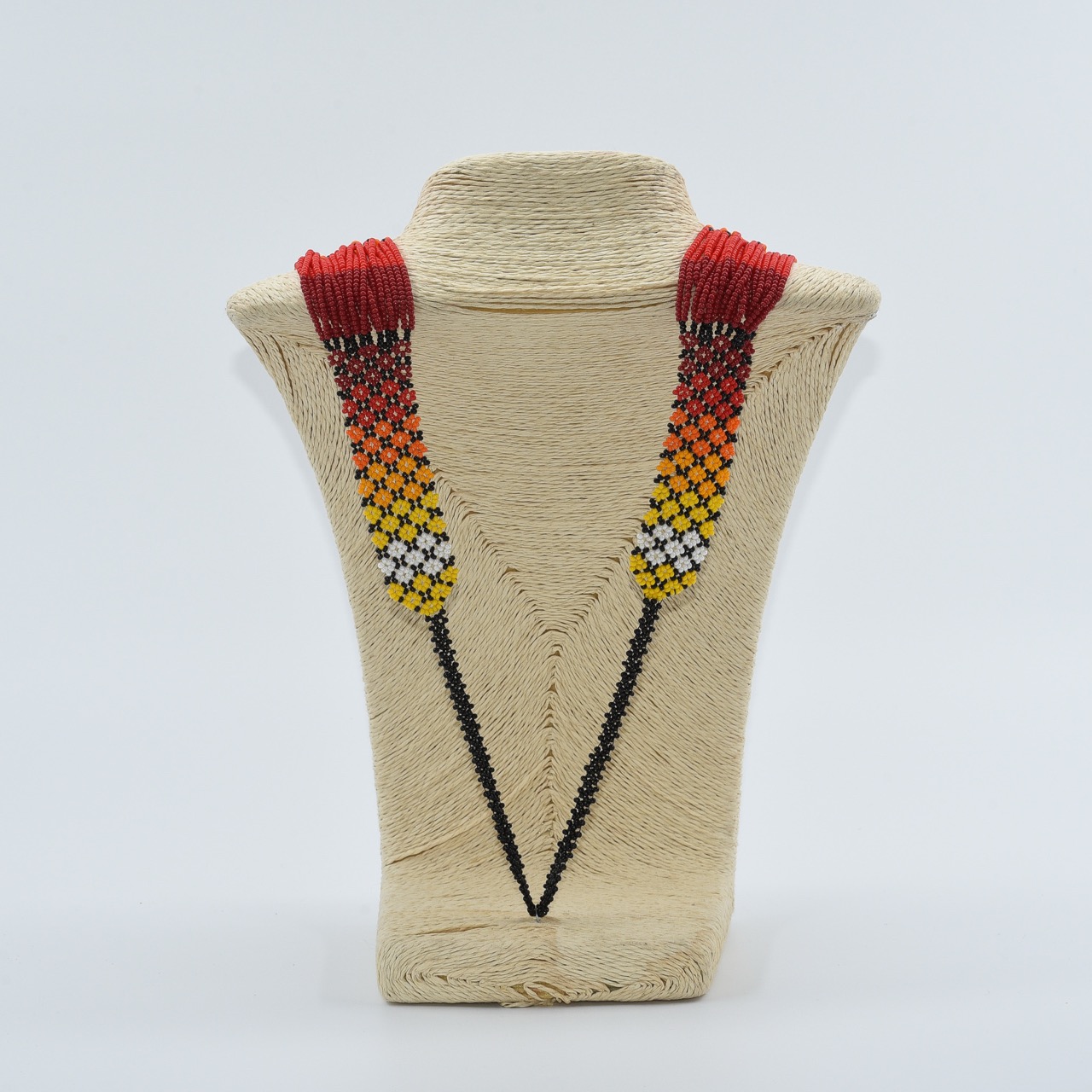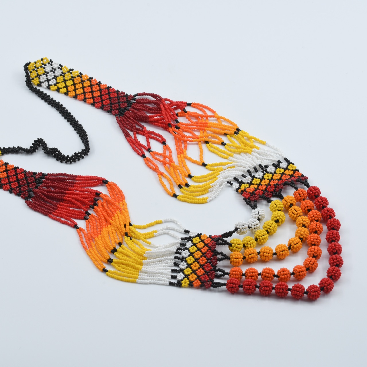 Bring vibrant tradition and bold artistry into your style with this handcrafted Emberá beaded necklace, inspired by the colors and spirit of fire. Made by Emberá artisans in Colombia, each necklace showcases generations of Indigenous beadwork mastery using high-quality glass seed beads in radiant tones of red, orange, yellow, black, and white.