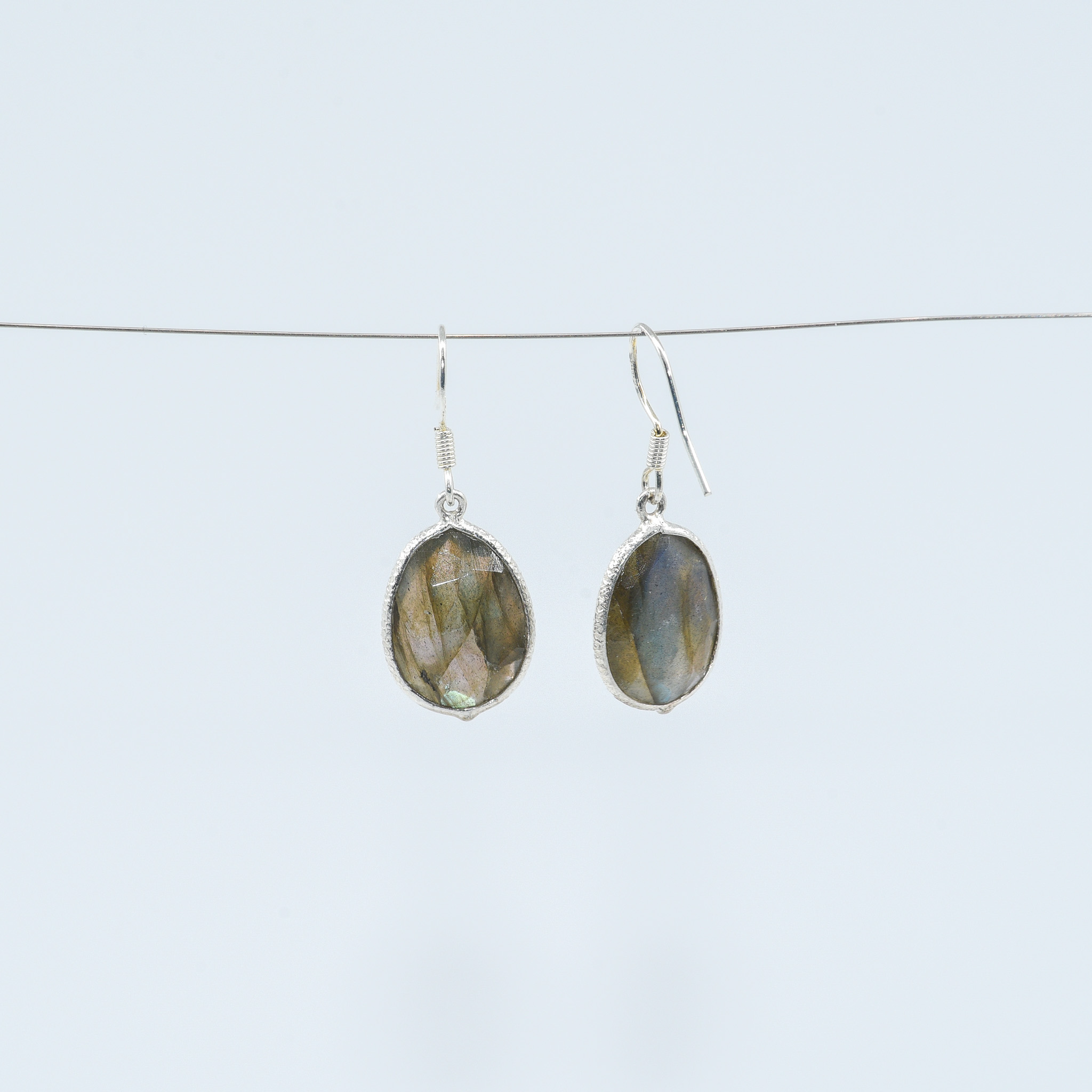 Elegant handcrafted earrings featuring mesmerizing natural labradorite gemstones set in 925 sterling silver. Each stone reveals a captivating play of colors — blue, green, and gold — that shifts beautifully with the light.