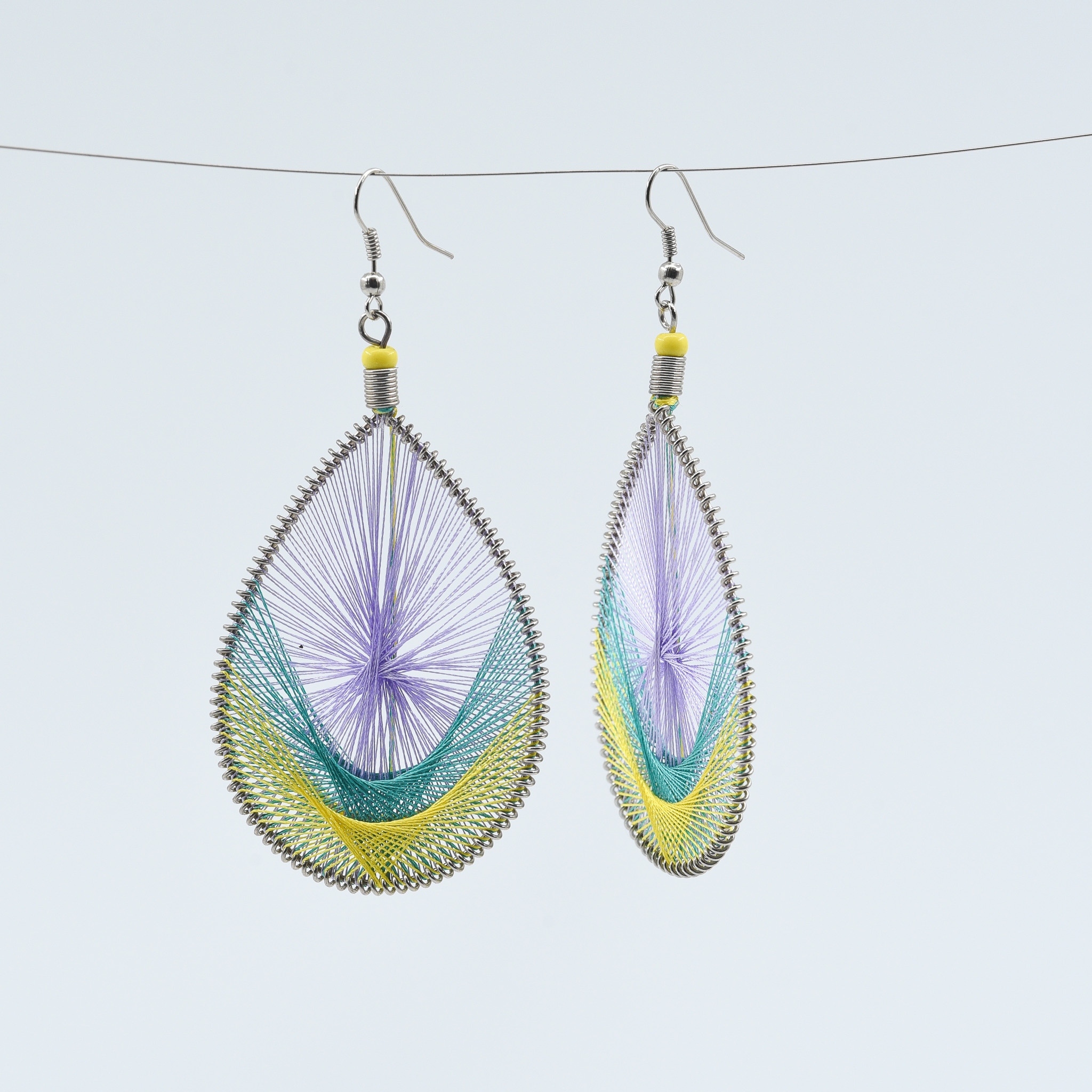 These earrings combine lavender and yellow tones in a delicate fan-like threadwork design. Handmade in Guatemala by indigenous artisans, the silver hook adds a refined finish to a lightweight, vibrant accessory.