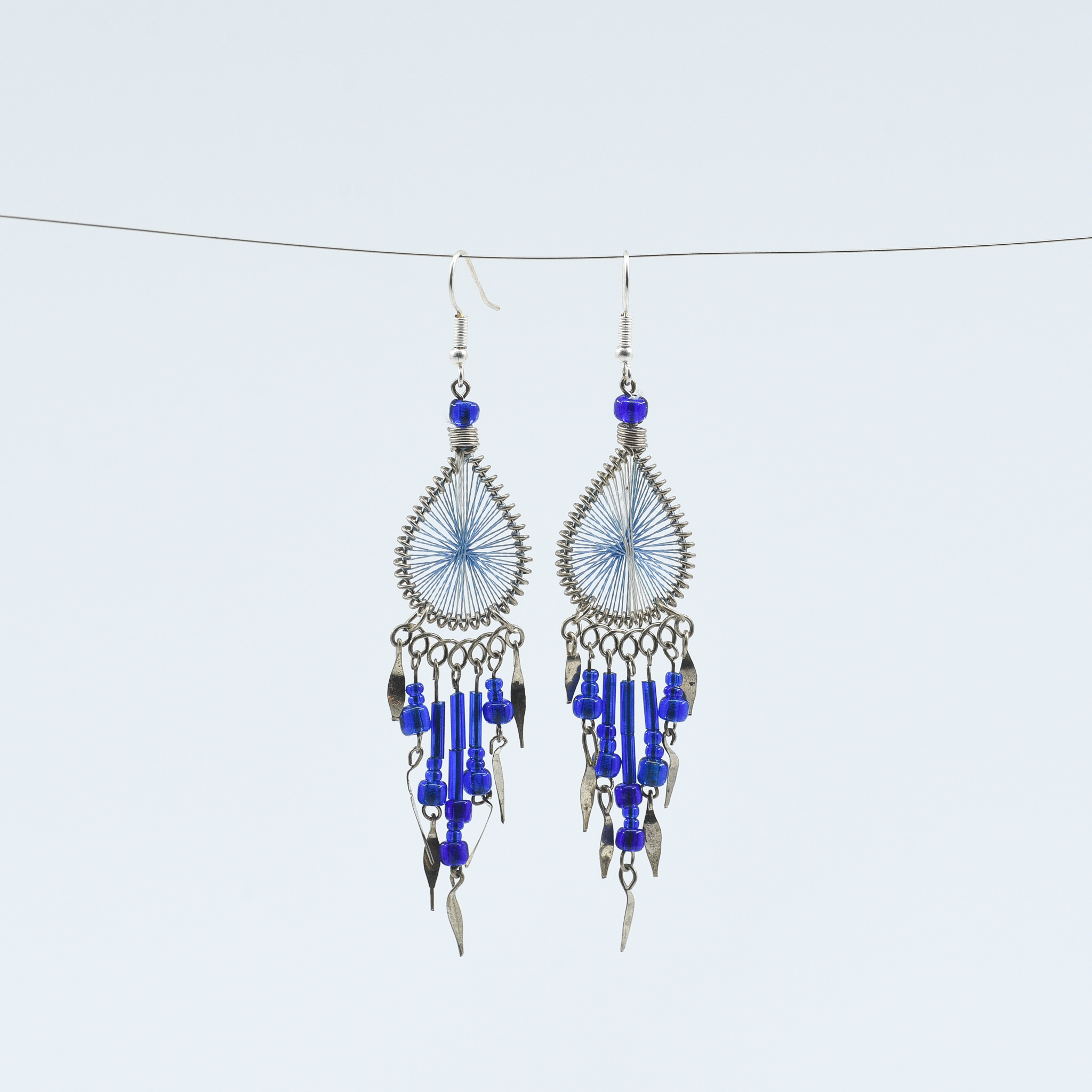 A beautifully handcrafted pair of earrings from Guatemala, Marino Claro captures the serene beauty of the Caribbean. The central thread is a translucent sea-blue tone, surrounded by shimmering deep blue glass beads that mimic ocean ripples. The intricate silver thread weaving brings a sense of elegance and balance, making these earrings a gentle yet eye-catching accessory.