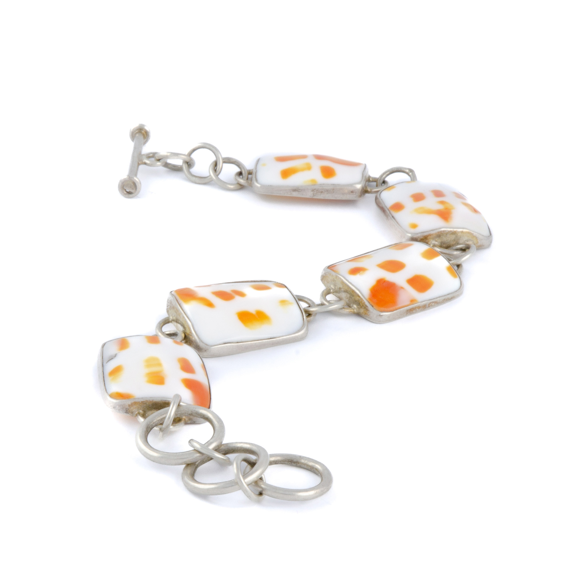 Refined craftsmanship meets natural beauty in this elegant Mexican Silver Bracelet, featuring rectangular inlays of lustrous shell. Each piece reflects the soft shimmer of the sea — iridescent, ever-changing, and uniquely organic.