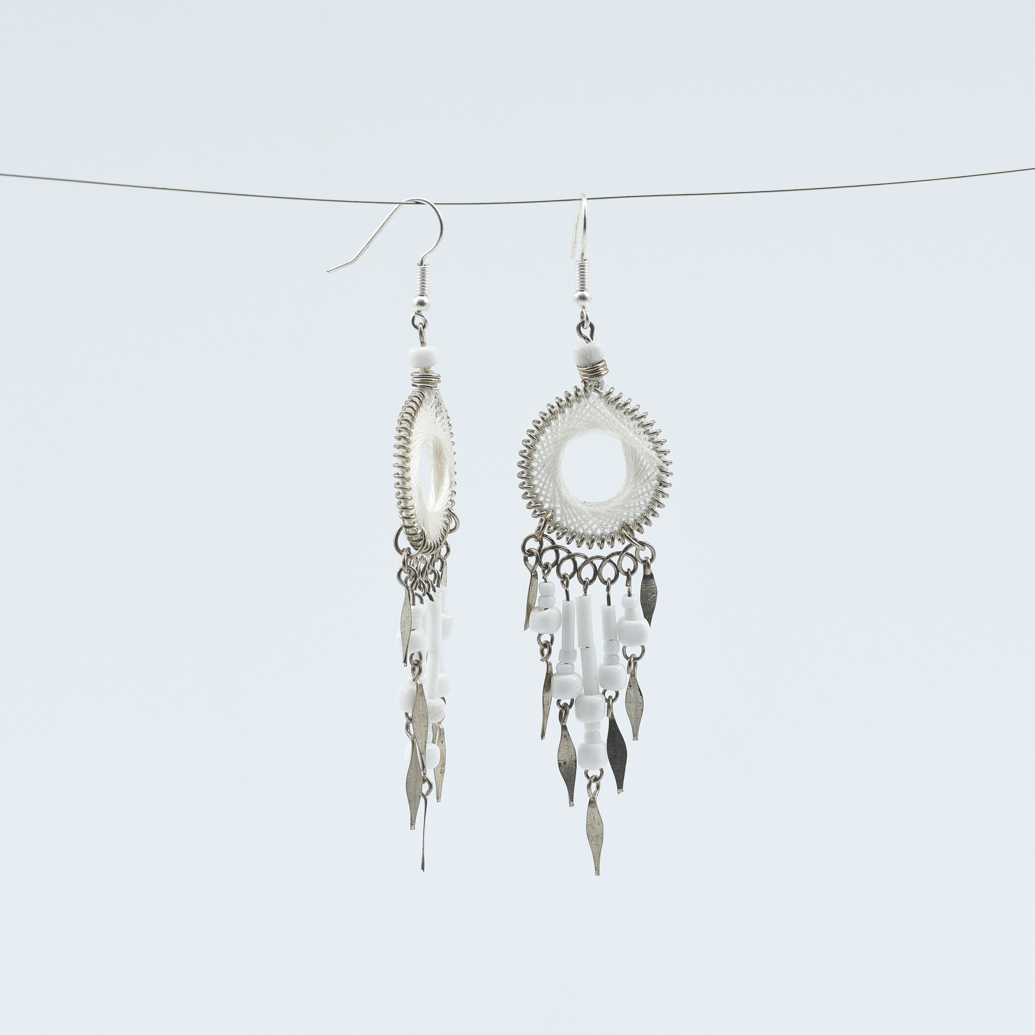 • Materials: White thread, clear beads, sterling silver hooks