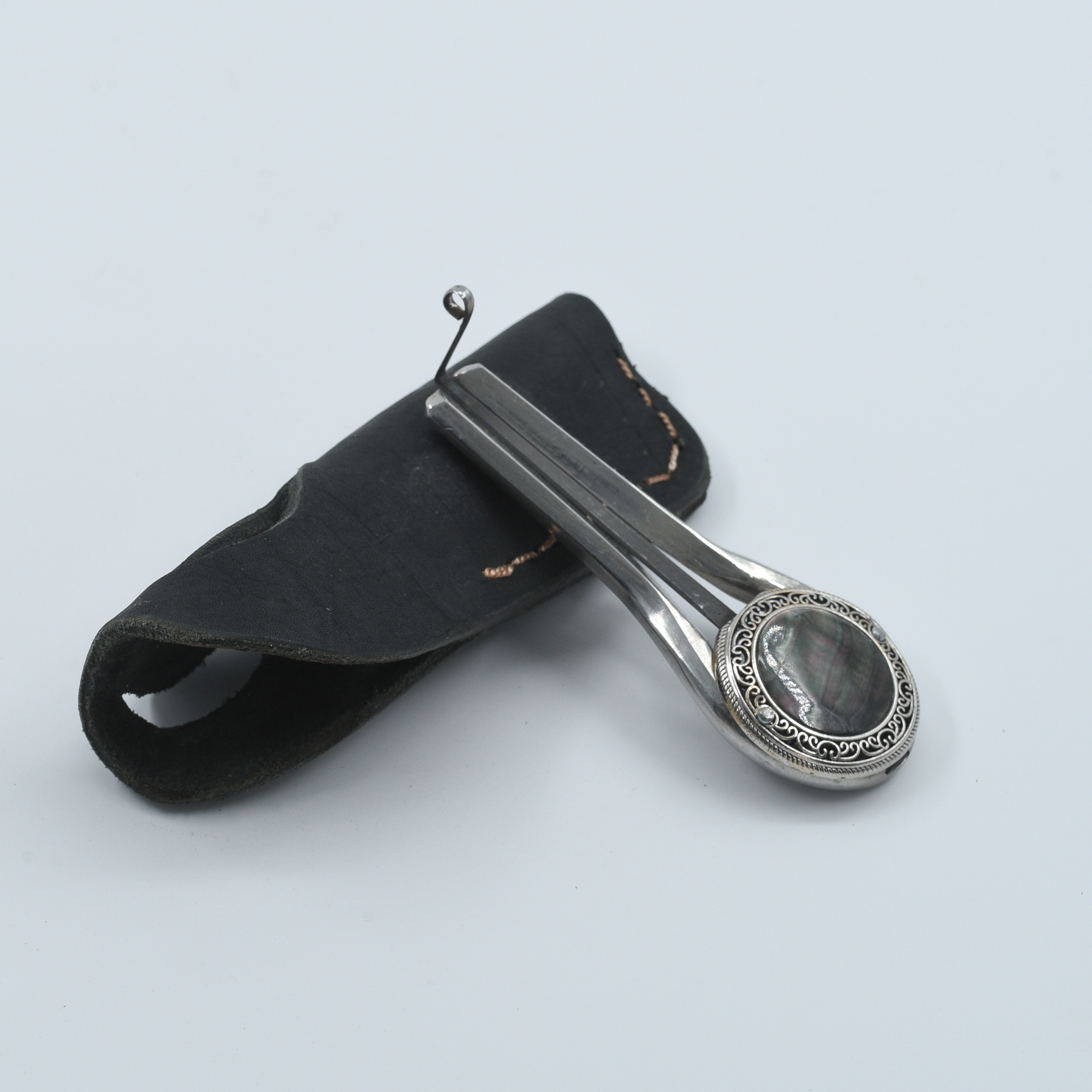 A finely crafted Jew’s harp featuring a polished metal frame and a beautifully engraved decorative cap. The instrument comes with a hand-stitched black leather case for protection and style — a perfect combination of elegance and sound quality.