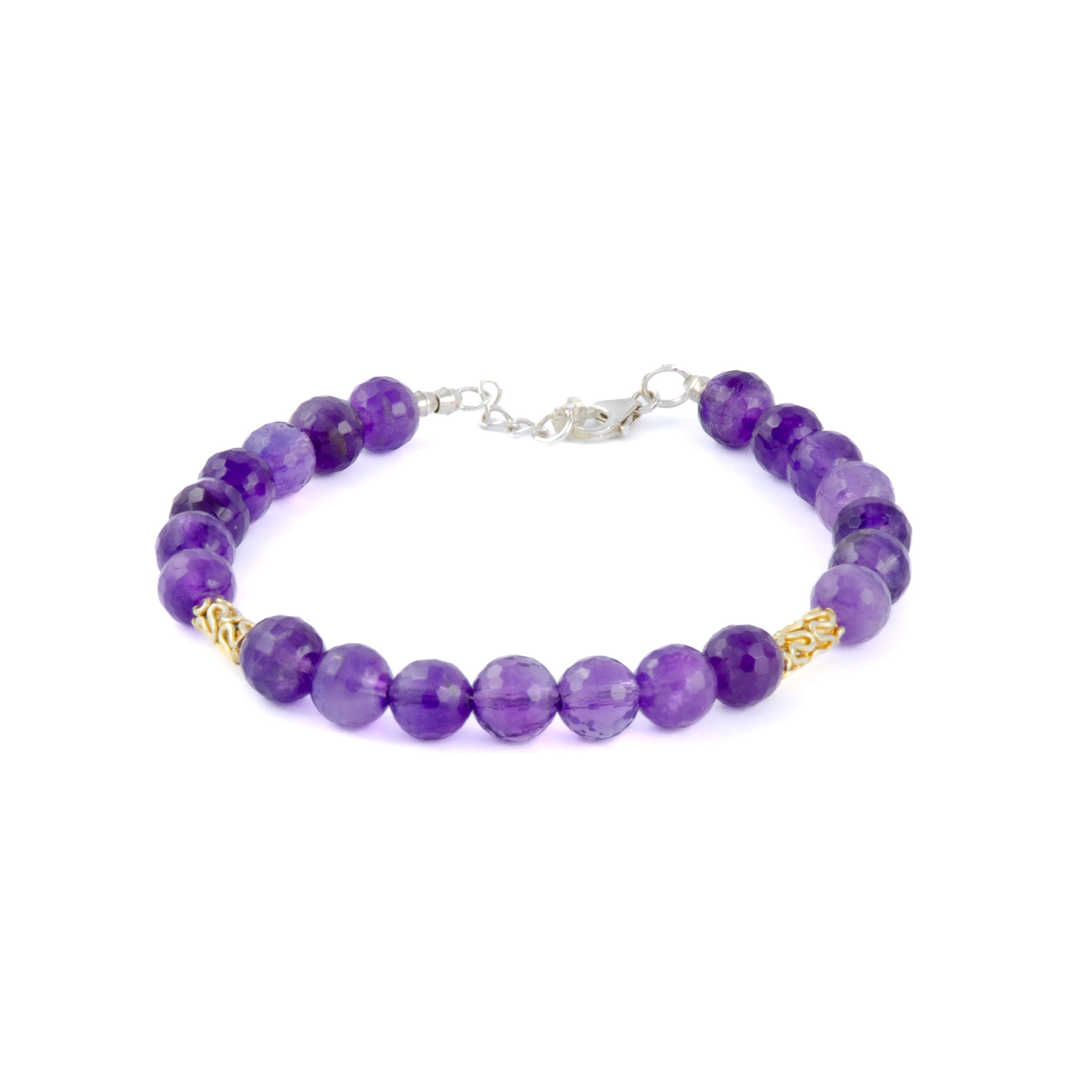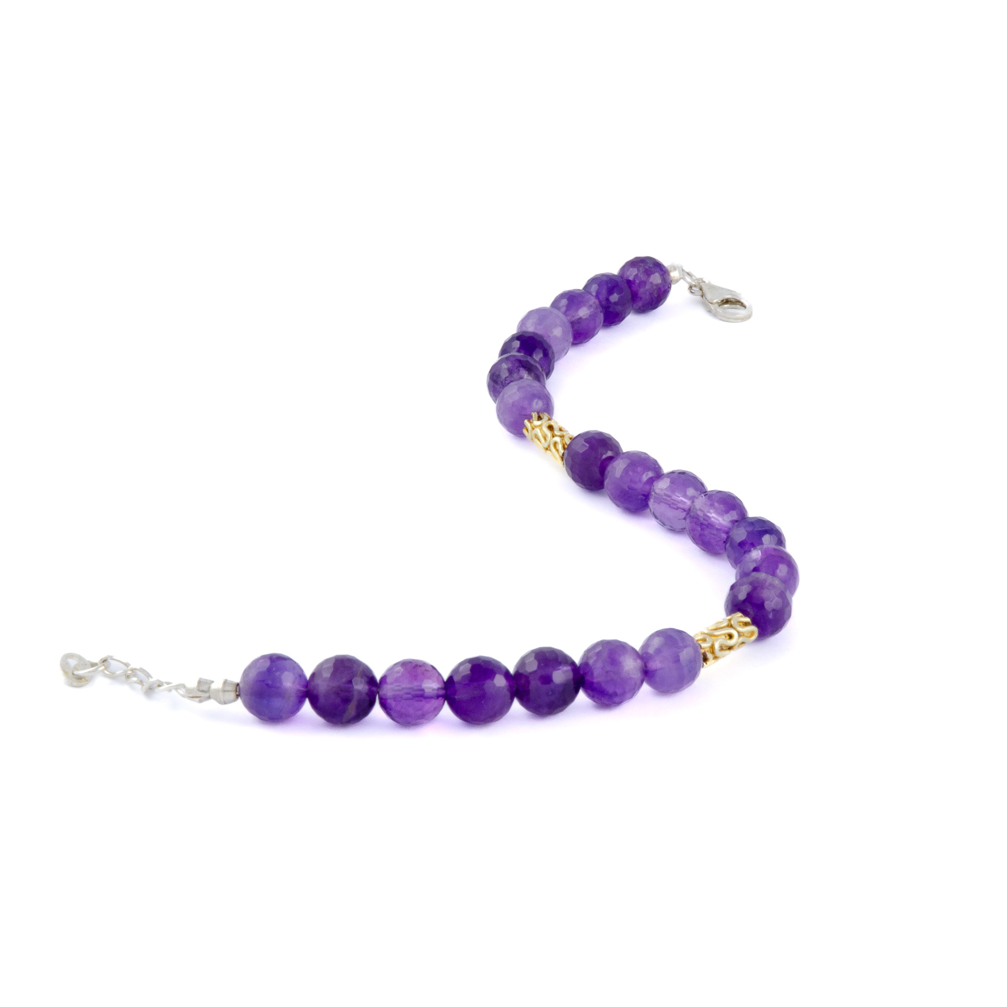This sophisticated bracelet features vibrant amethyst beads paired with gold-plated decorative spacers, creating a luxurious contrast of color and shine. The Swiss craftsmanship ensures durability and refined details. Amethyst is a stone often associated with wisdom and emotional clarity, making this piece both meaningful and stylish.
