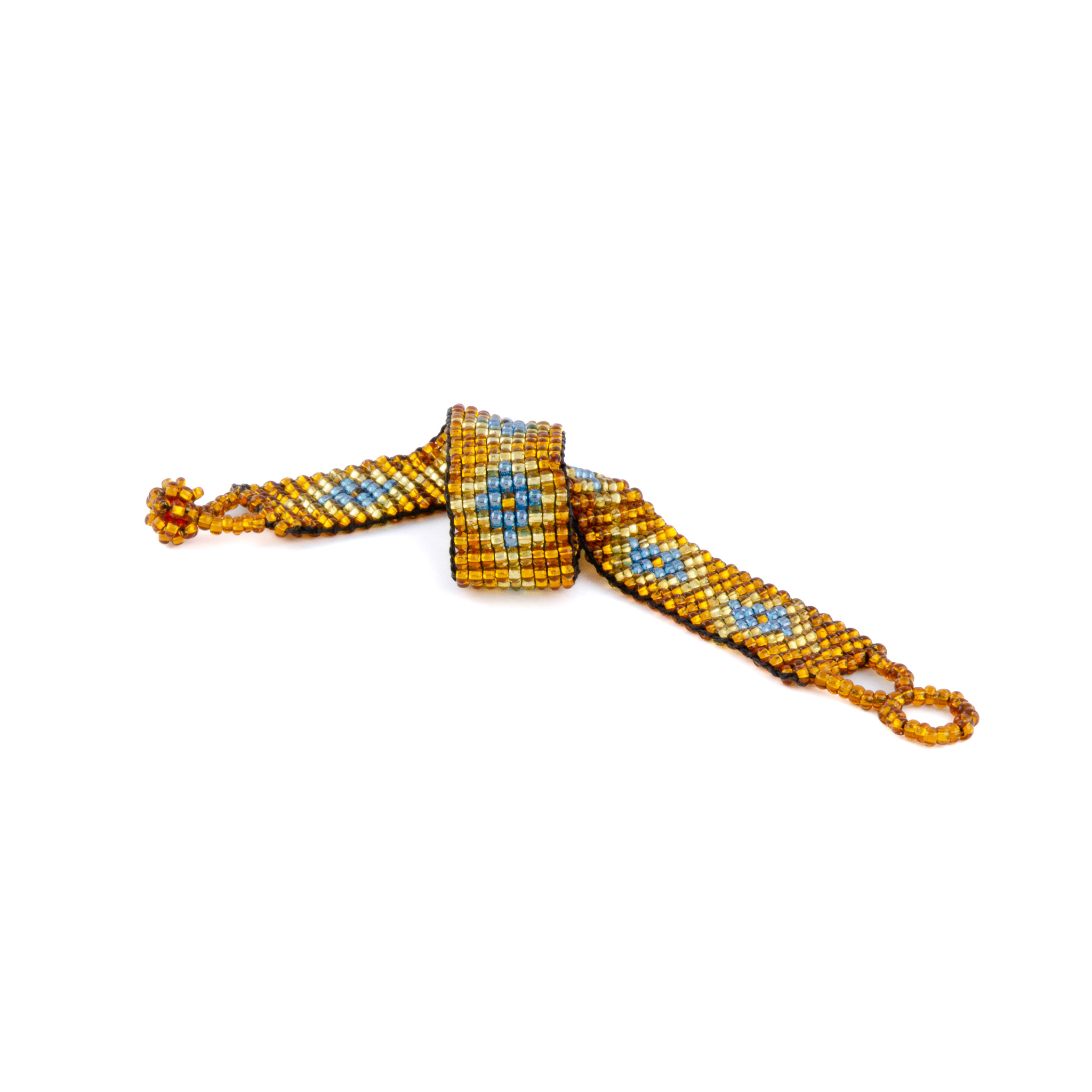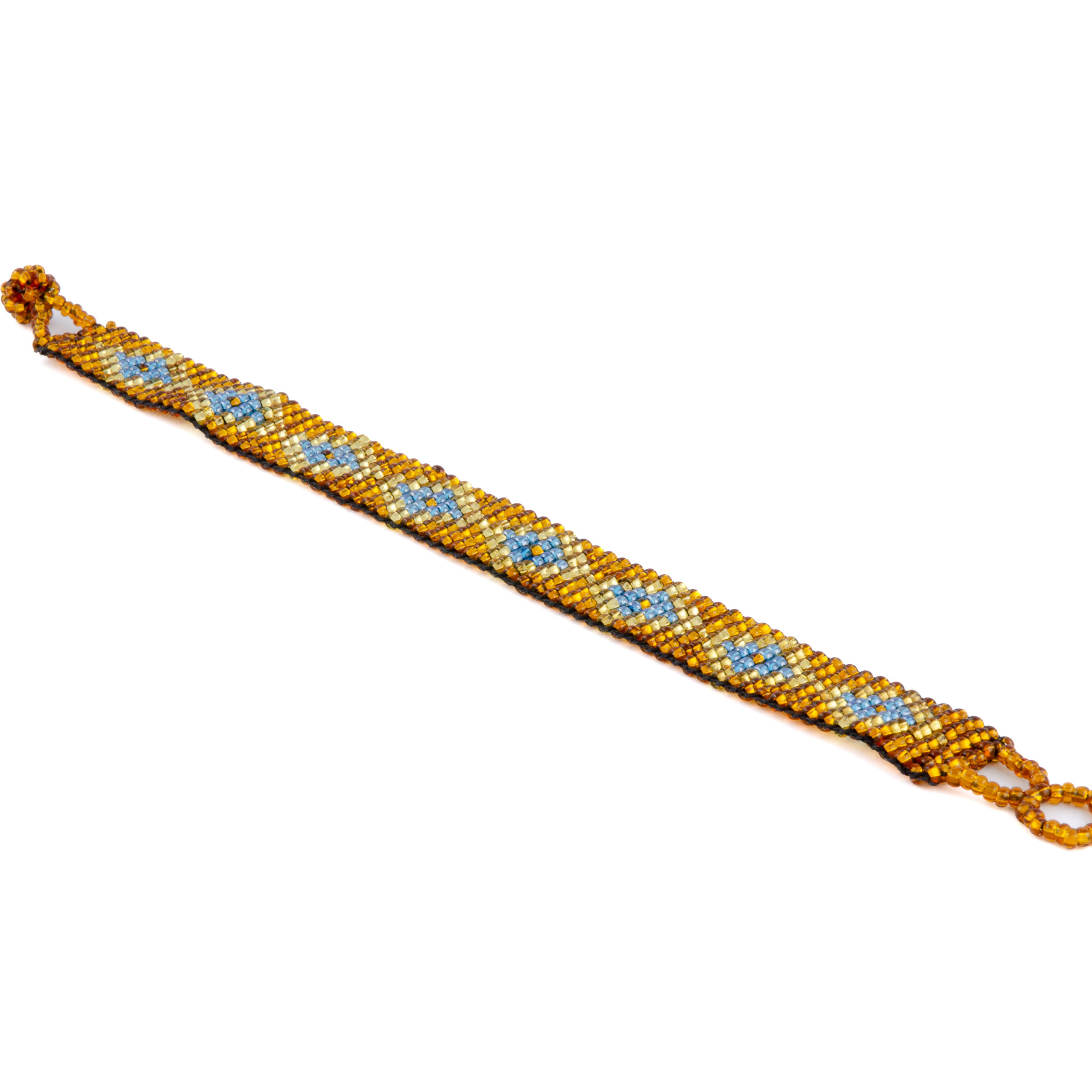 With its luminous gold and bronze base, and repeating blue motifs, this bracelet honors the power of the sun. It was lovingly handwoven by an Indigenous woman artisan in Guatemala, continuing a legacy of cultural storytelling through beadwork.