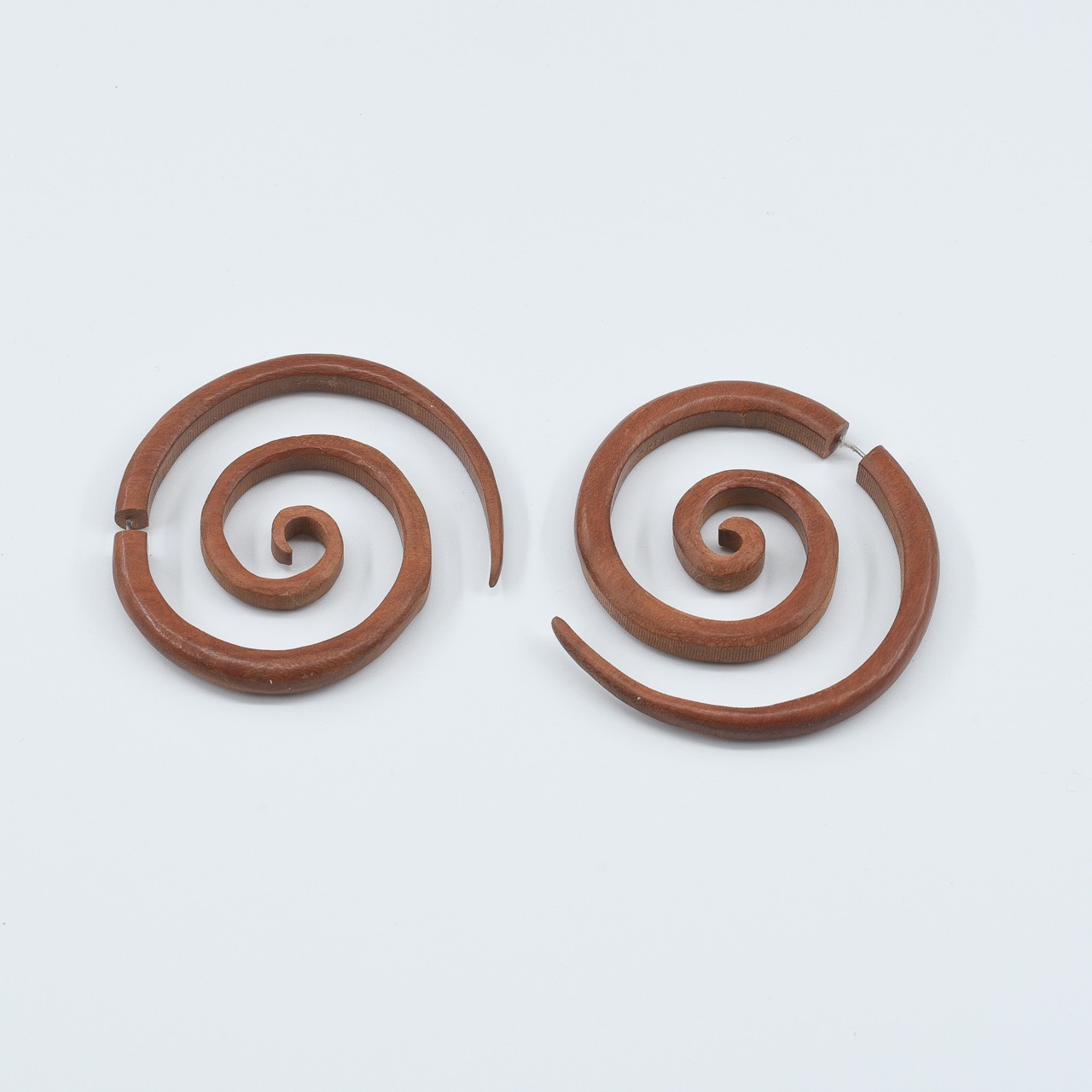 These large spiral-shaped earrings are hand-carved from a warm, reddish wood. The continuous spiral form symbolizes growth, evolution, and the cyclical nature of life. The smooth curves and flowing lines reflect a sense of harmony and natural rhythm, making them a perfect piece for those seeking balance and spiritual grounding. Despite their size, the earrings are lightweight and comfortable to wear, ideal for festivals, casual wear, or anyone drawn to sacred geometry and timeless shapes.