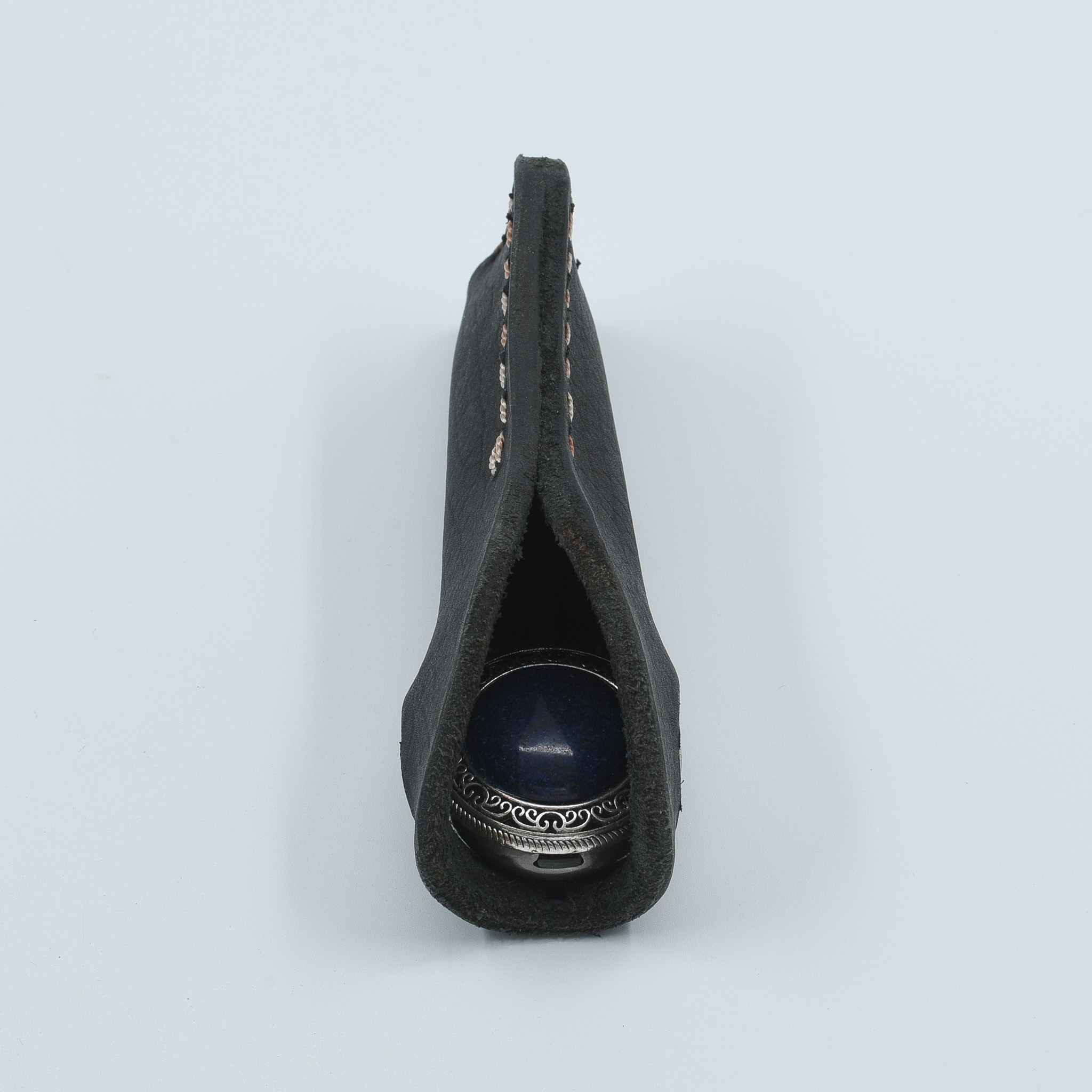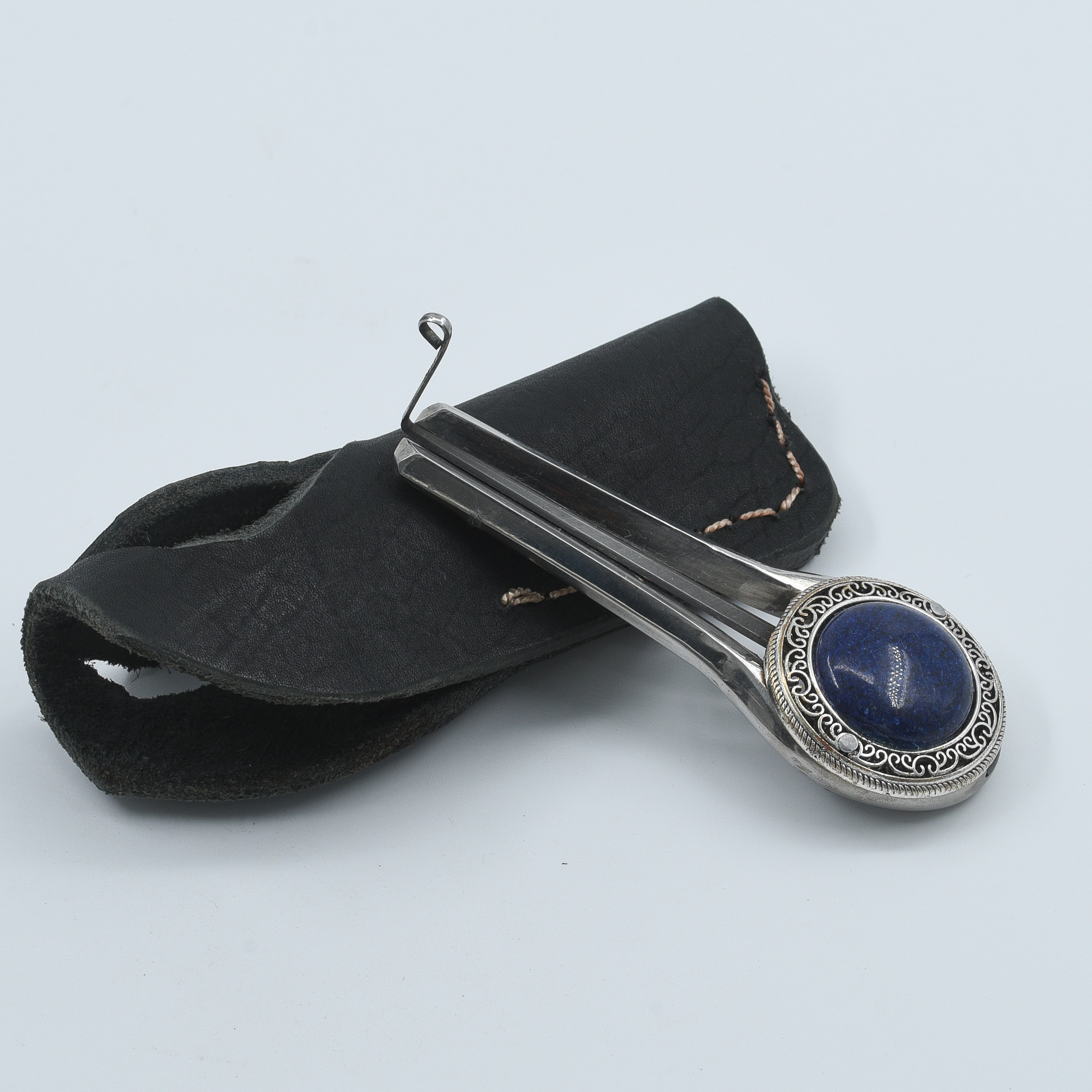Blue gemstone in ornate silver setting