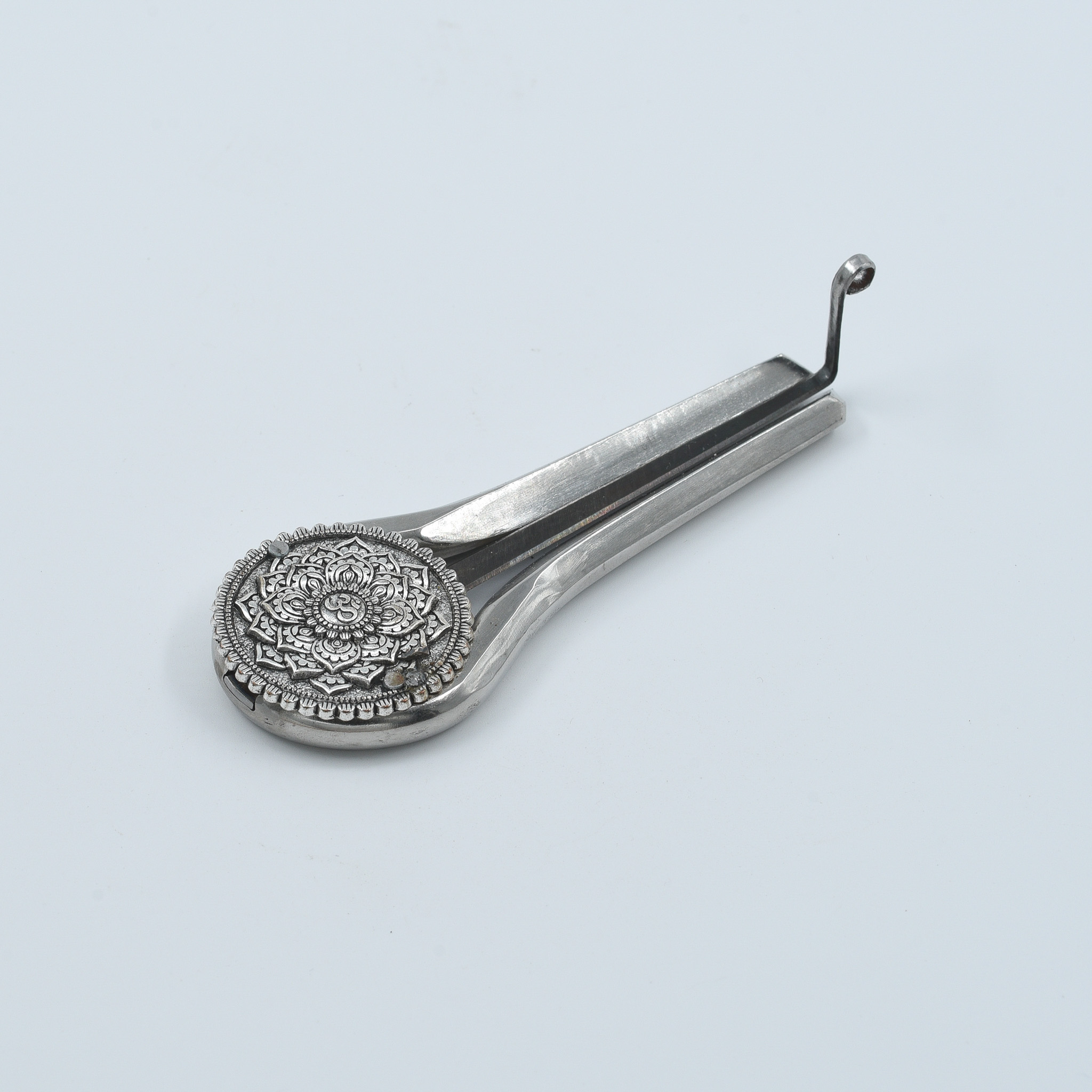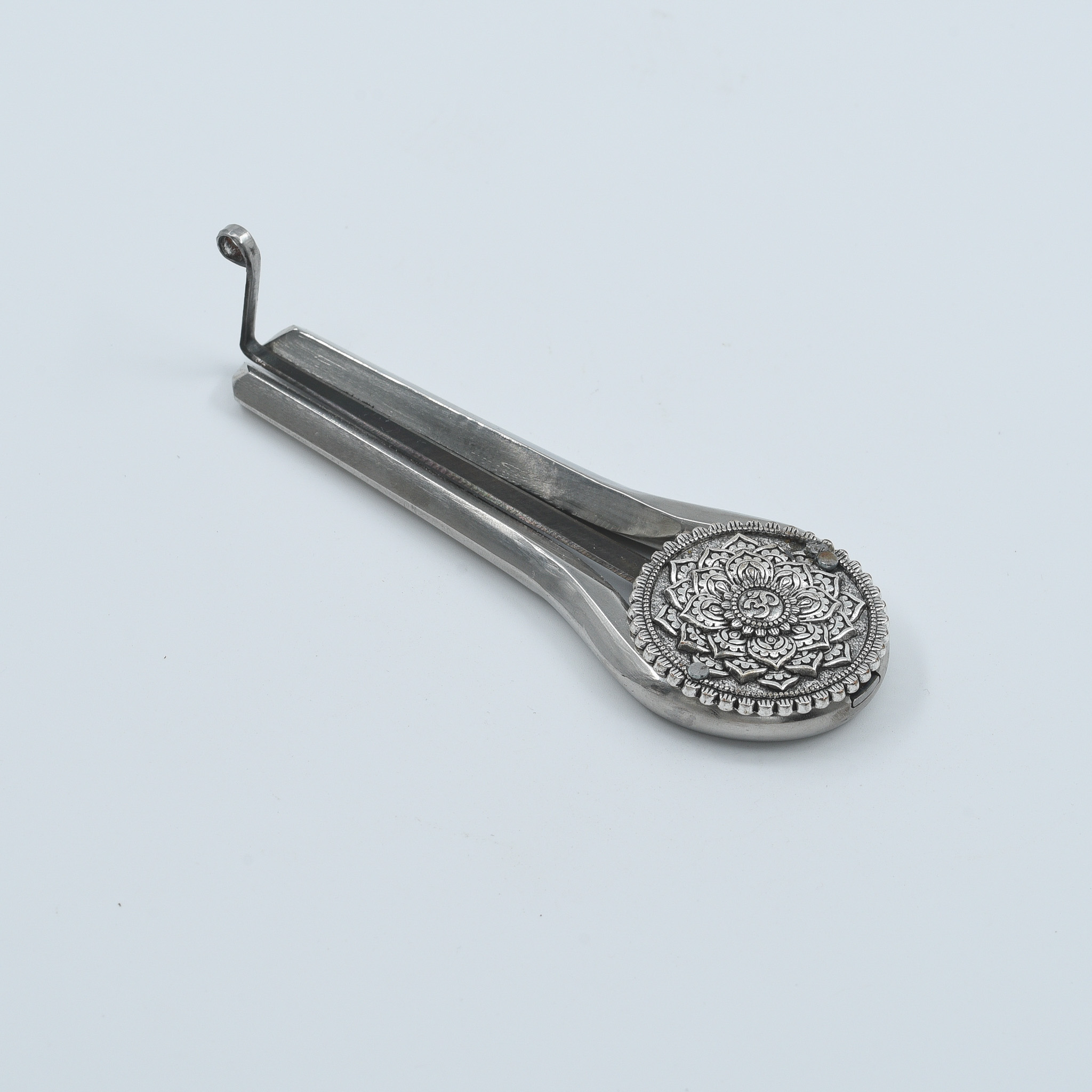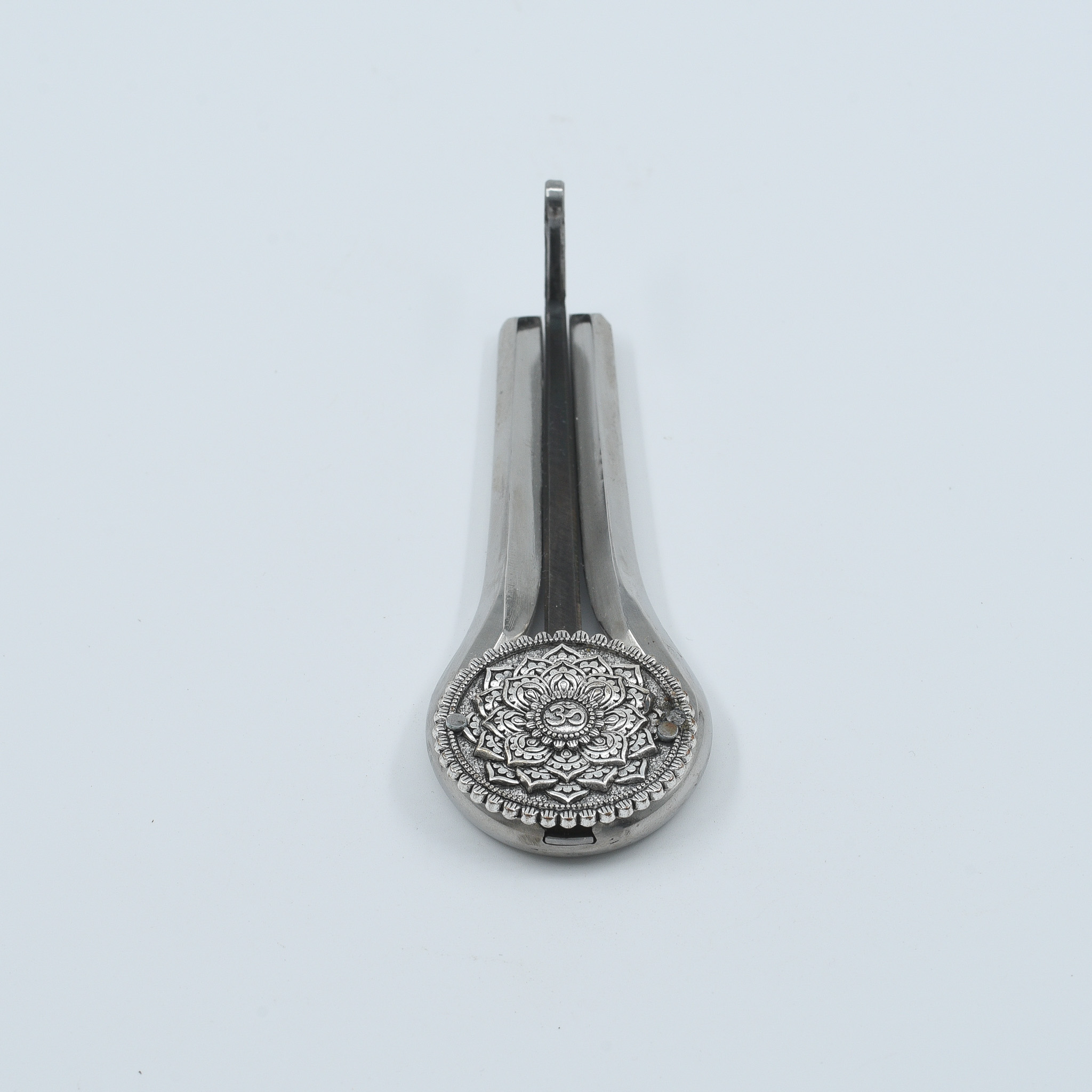 • Solid steel body with hand-engraved mandala & Om symbol